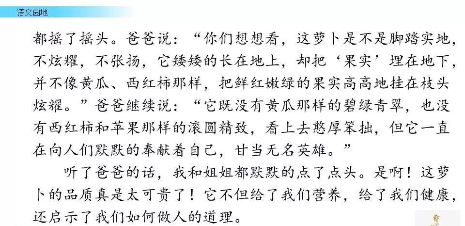 父亲说:“花生的好处很多,有一样最可贵:它的果实埋在地里,不像桃子、石榴、苹果那样,把鲜红嫩绿的果实高高地挂在枝头上,使人一见就生爱慕之心。你们看它矮矮地长在地上,等到成熟了,也不能立刻分辨出来它有没有果实,必须挖起来才知道。”
