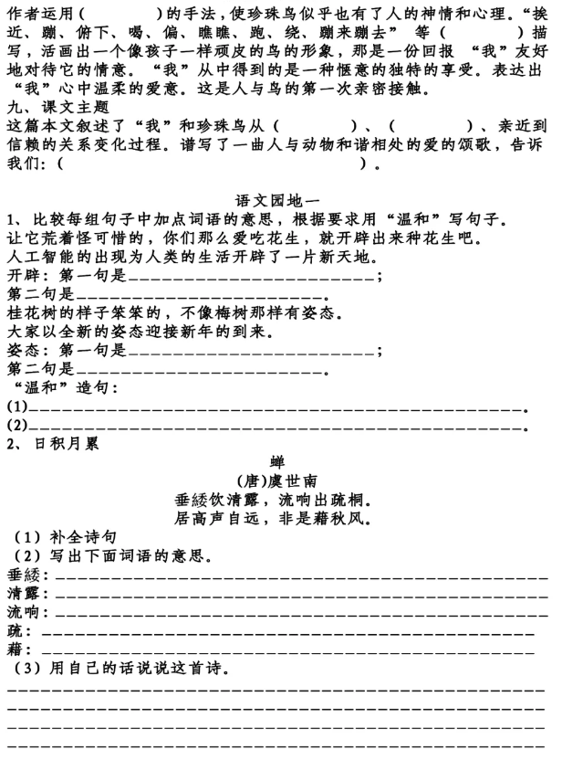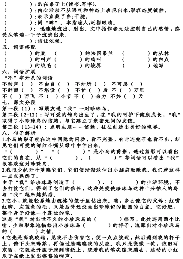 第二段(2-12):写可爱的雏鸟出生了,在“我的呵护下健康成长,“我”取得了小珍珠鸟的信赖,与它建立了亲密无间的友谊。