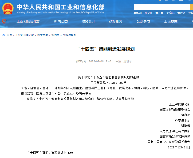 为贯彻落实《中华人民共和国国民经济和社会发展第十四个五年规划和 2035年远景目标纲要》《“十四五”制造业高质量发展规划》等文件要求,加快推动智能制造发展,工业和信息化部发布了《“十四五”智能制造发展规划》,提出:“十四五”及未来相当长一段时期,推进智能制造,要立足制造本质,紧扣智能特征,以工艺、装备为核心,以数据为基础,依托制造单元、车间、工厂、供应链等载体,构建虚实融合、知识驱动、动态优化、安全高效、绿色低碳的智能制造系统,推动制造业实现数字化转型、网络化协同、智能化变革。