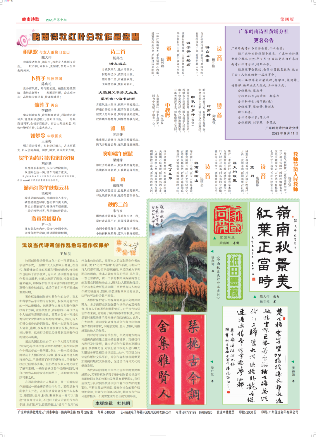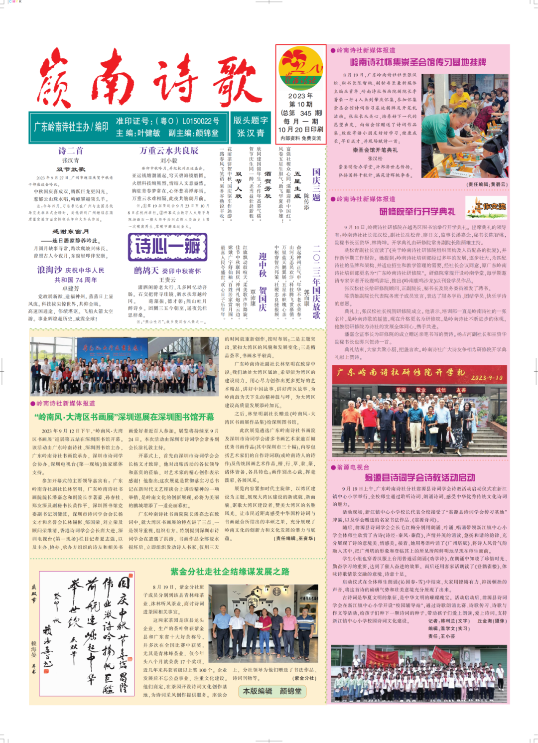 广东岭南诗社是广东省领导刘田夫、李坚真、许士杰等于1987年创办的省级社团。军地领导及社会知名人士卢瑞华、黄华华、马万祺、寇庆延、欧初、杨应彬、肖耀堂、于飞、周玉书、刘鹤翘、姜林东、关山月、刘麒子等曾担任诗社名誉社长。张汉青任社长20余年,提出“人品、诗品、社品”三品为立社宗旨,坚守诗词的一方净土,诗社不断健康发展壮大。现任社长张汉松,副社长冼松青、林坚明、廖日文、叶健敏、杨占河、谢飘云、陈章智、曾新友,秘书长陈智桃。