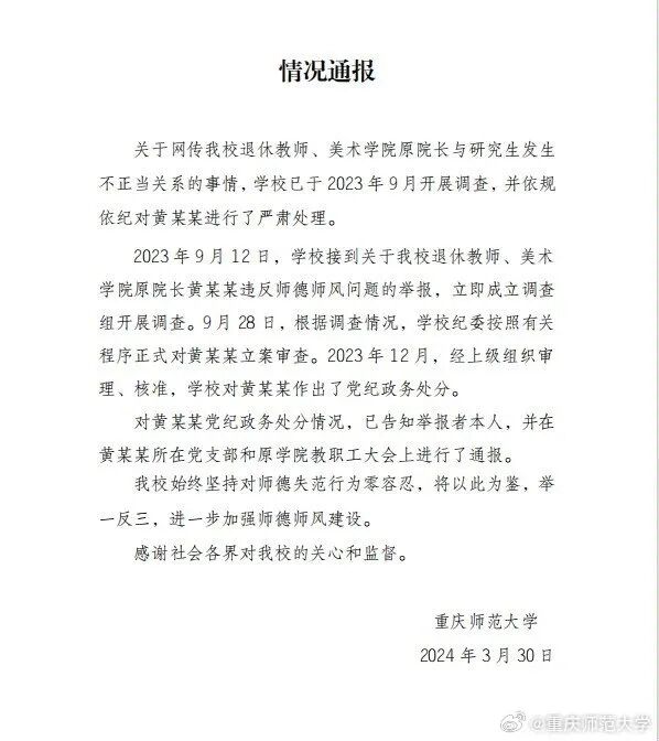 关于网传我校退休教师、美术学院原院长与研究生发生不合法关系的事情,学校已于2023年9月开展查询,并依规依纪对黄某某进行了严峻处理。