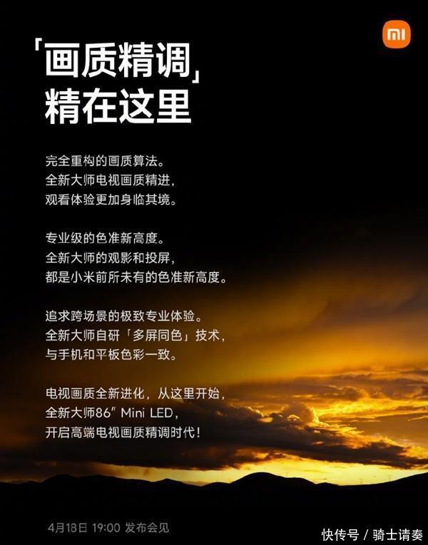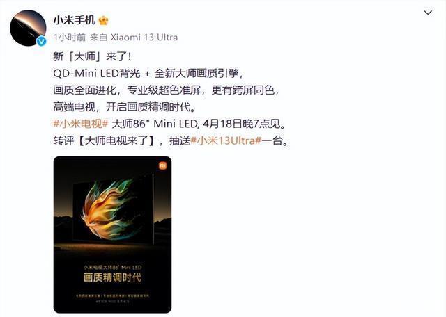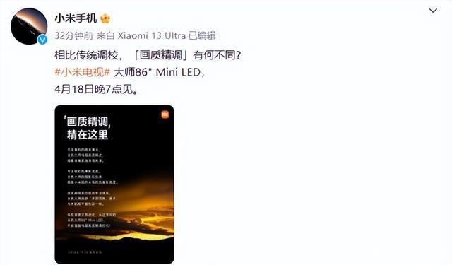 ?????? 小米大师86"MiniLED电视将在4月18日的发布会上,与小米13Ultra、小米手环8等新品同步发布。