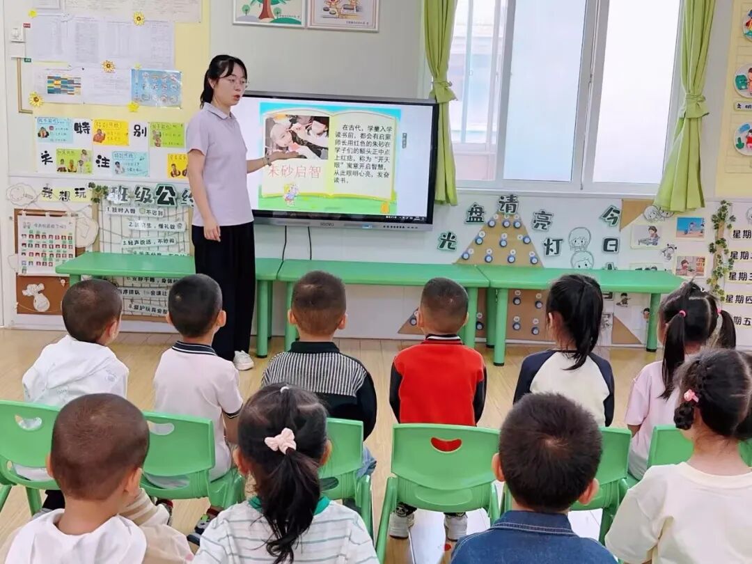 朱砂启智是端午节的传统习俗之一。瞧,老师在孩子们的额头正中间点上朱砂,额间一点,喜乐安然。点朱砂也称“ 点额”,端午节给孩子额头上点上朱砂意为开启智慧,也寓意身体健康、平平安安。