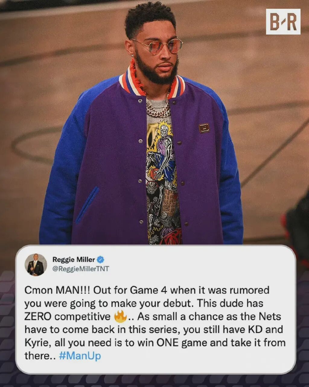 雷吉-米勒第一时间批评西蒙斯:“拜托,兄弟,当外界传言你要在G4上演首秀时,你缺席了。这家伙毫无竞争心,尽管篮网能扳回这个系列赛的可能性很小,但你还有杜兰特和欧文,你所需要做的只是帮助他们拿下一场比赛,然后开始尝试去逆转系列赛……”