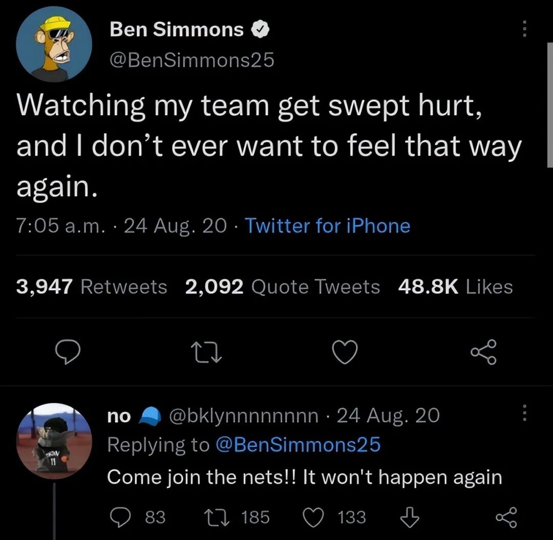 有球迷挖出了西蒙斯2020年季后赛因伤没打首轮时发的推特,当时76人被绿军4-0横扫。西蒙斯在那条推特上写道:“坐在场边看着队友被横扫很伤人,我永远不想再体验这种感觉。”
