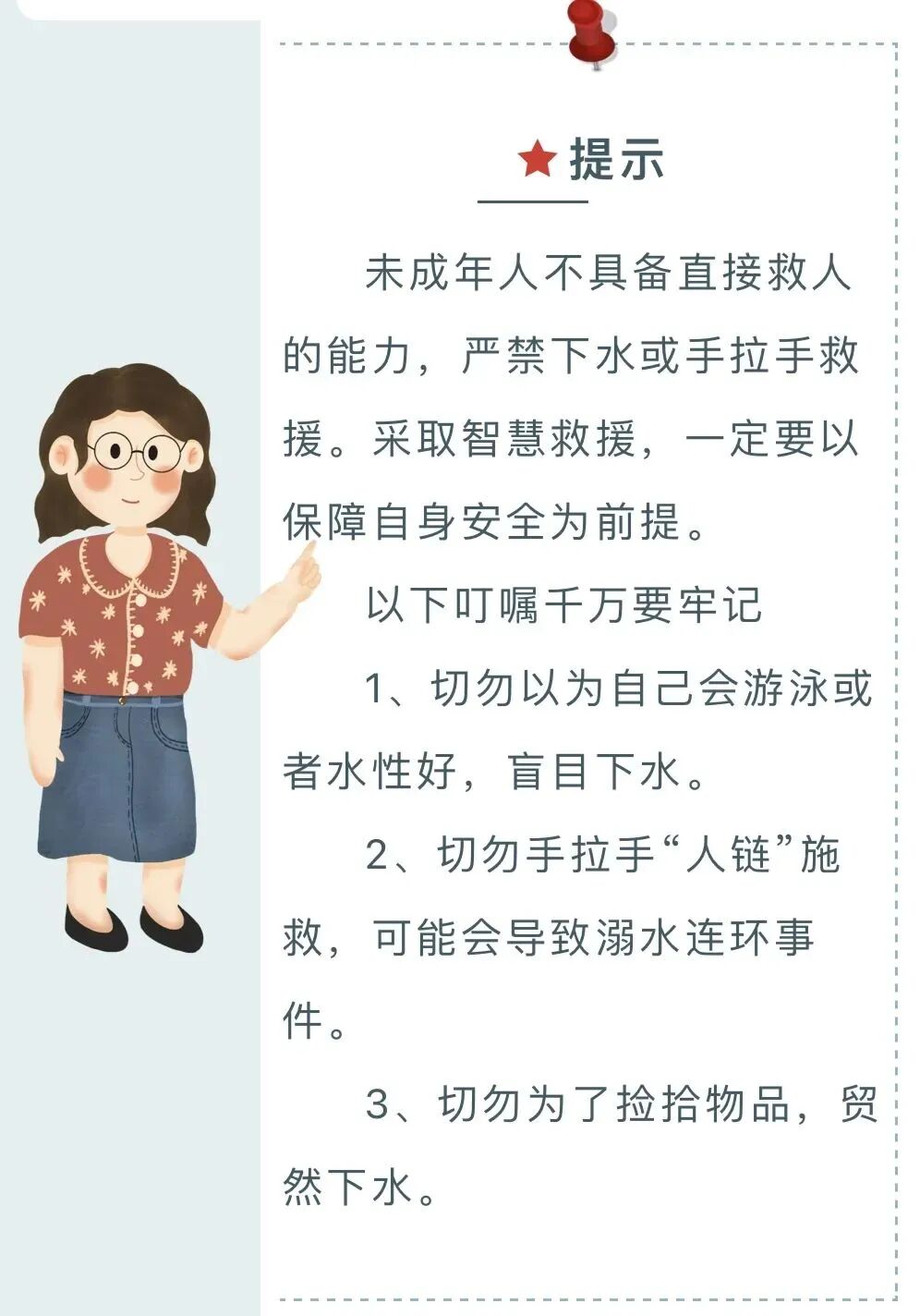 在户外游玩,池塘、水库、小河以及较深的积水坑、泳池、户外喷泉、公园游湖、海边、嬉水区也是溺水高发区,儿童不靠近,不接近。