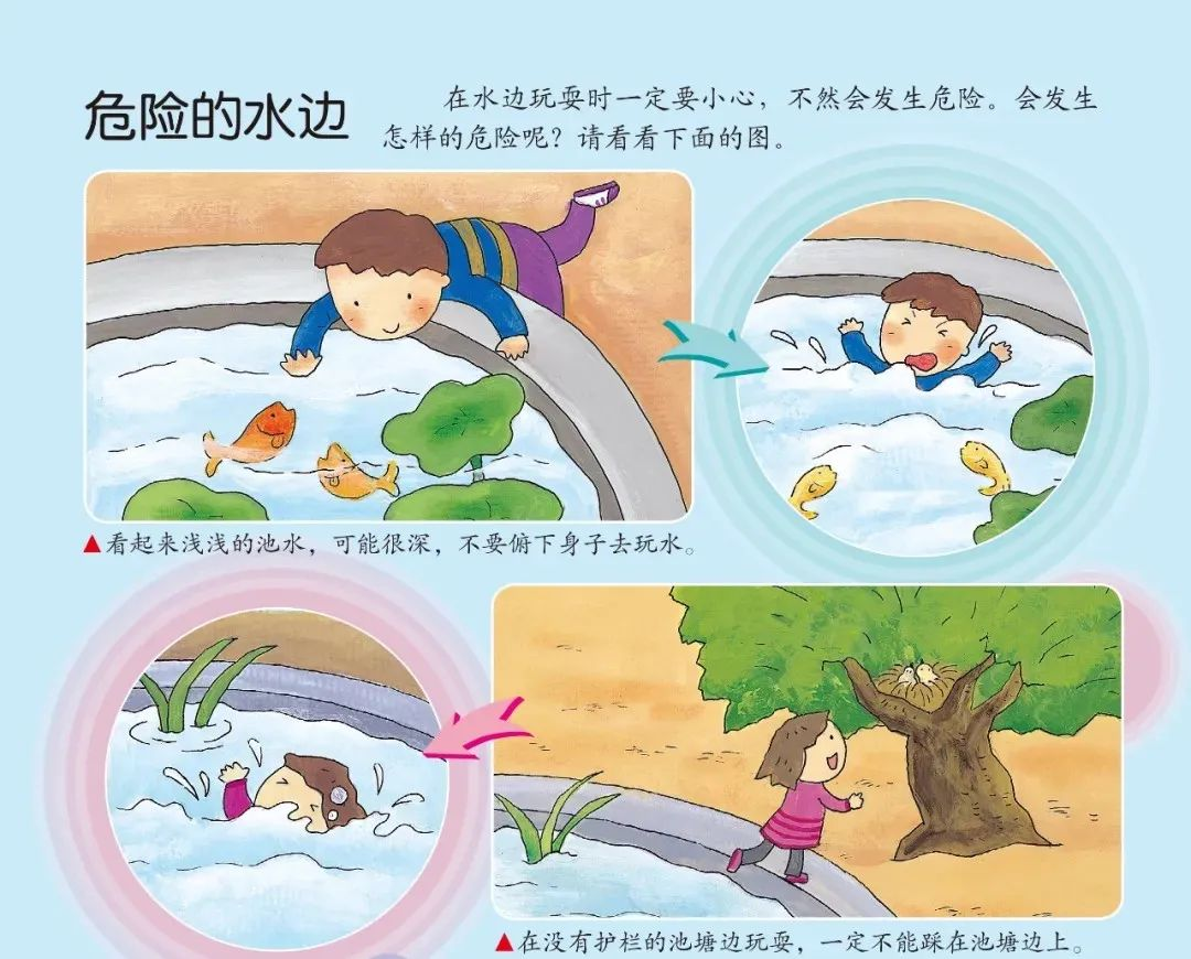 家长可以通过绘本的形式,提高孩子安全防范意识,在阅读的过程中,让幼儿初步认知溺水的危害与自我救护的方法。
