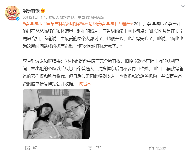 而且,即使放眼娱乐圈也不算什么新鲜事,比如最近很火的“爷孙恋”男主音乐人李坤城去世后,妻子与继子争遗产的事情。