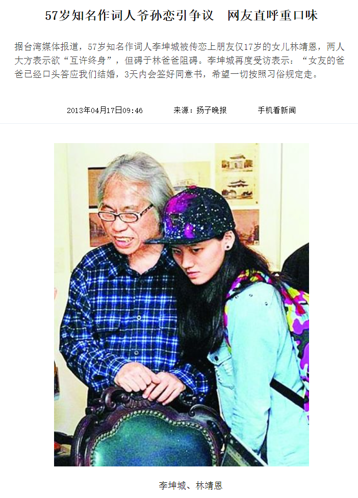 当时,57岁的李坤城被好友邀请以家教身份辅导女儿林靖恩,没想到,两人很快就相恋走到了一起,而当得知女方17岁的年纪后,瞬间引爆了舆论。