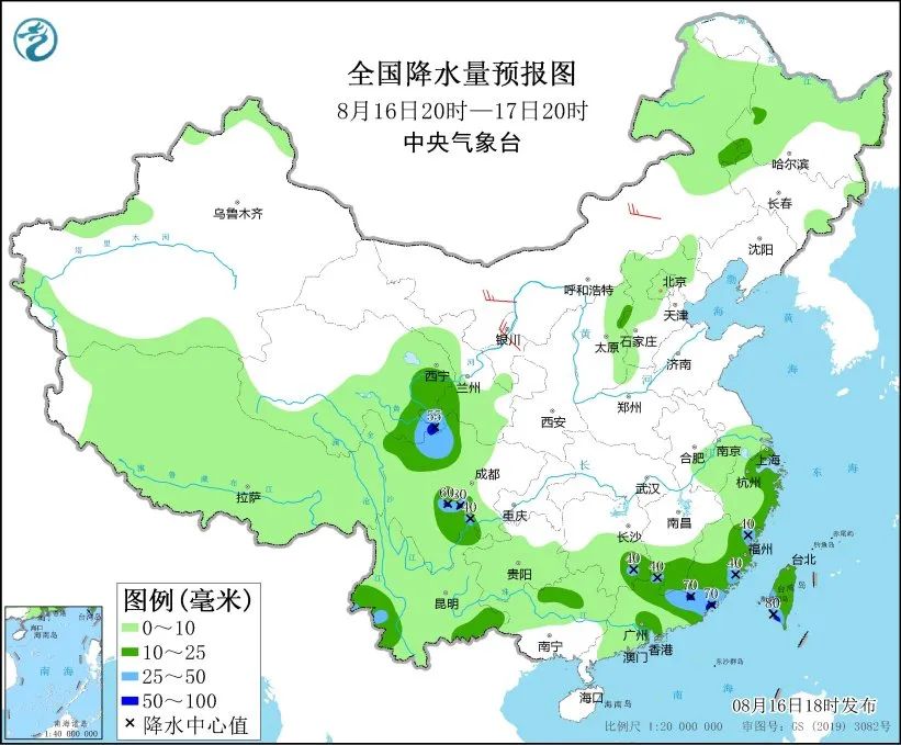16日20时至17日20时,青海东南部、甘肃陇东西部、四川北部和东南部、云南西部、东南部和东北部、广西北部、广东中东部、湖南东南部、江西南部、福建大部、浙江东部、台湾岛等地部分地区有中到大雨,局地有暴雨。
