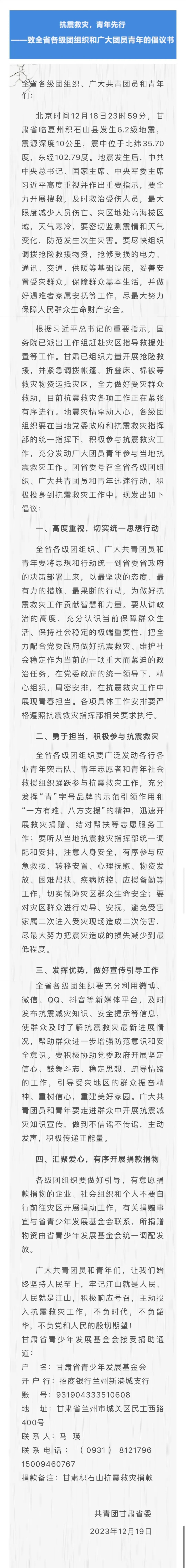 ntent="t" style="padding: 5px 1em;outline: 0px;font-size: 16px;letter-spacing: 1px;background: rgb(0, 122, 170);visibility: visible;">ntent="t" style="outline: 0px;color: rgb(255, 255, 255);visibility: visible;">共青团中央开展ntent="t" style="padding: 5px 1em;outline: 0px;font-size: 16px;letter-spacing: 1px;background: rgb(0, 122, 170);visibility: visible;">ntent="t" style="outline: 0px;color: rgb(255, 255, 255);visibility: visible;">应急救援服务工作共青团中央迅速向团甘肃省委划拨团费100万元、向团青海省委划拨团费30万元,专项支持基层团组织开展抗震救灾工作。启动中国青年志愿者协会应急响应机制,成立工作专班、加强工作协同,安排专门力量于19日上午到达灾区,指导、支持团甘肃省委在属地应急救援指挥部的指导下积极有序开展抗震救灾应急救援志愿服务,指导临近省份做好相关应急救援及志愿服务准备工作。ntent="t" style="padding: 5px 1em;outline: 0px;font-size: 16px;letter-spacing: 1px;background: rgb(0, 122, 170);">ntent="t" style="outline: 0px;color: rgb(255, 255, 255);">团属基金会向灾区ntent="t" style="padding: 5px 1em;outline: 0px;font-size: 16px;letter-spacing: 1px;background: rgb(0, 122, 170);">ntent="t" style="outline: 0px;color: rgb(255, 255, 255);">紧急拨付170万元公益资金中国青少年发展基金会、中国光华科技基金会、中国青年就业创业基金会等3家团属基金会向灾区紧急拨付170万元公益资金,同时面向社会发起抗震救灾公益募捐活动,目前已按灾区第一批需求清单开展物资筹集采买工作。rame class="video_iframe rich_pages" data-w="720" data-ratio="0.5625" data-cover="http%3A%2F%2Fmmbiz.qpic.cn%2Fsz_mmbiz_jpg%2F7hxJRjsnhfmdMBoeBFicDu63xebmUkaxfL0ibwhCe6iaO9AzYkewviaicp2X1yq5YmvFjmbiaiazlUhicuSBupSibnZDrxA%2F0%3Fwx_fmt%3Djpeg" data-mpvid="wxv_3244343967702466561" data-vidtype="2" allowfullscreen="" frameborder="0" style=" z-index: 1;border-radius: 4px; " data-src="https://mp.weixin.qq.com/mp/readtemplate?t=pages/video_player_tmpl&action=mpvideo&auto=0&vid=wxv_3244343967702466561">rame>ntent="t" style="padding: 5px 1em;outline: 0px;font-size: 16px;letter-spacing: 1px;background: rgb(0, 122, 170);">ntent="t" style="outline: 0px;color: rgb(255, 255, 255);">甘肃共青团组织力量ntent="t" style="padding: 5px 1em;outline: 0px;font-size: 16px;letter-spacing: 1px;background: rgb(0, 122, 170);">投入救灾工作临夏州积石山县6.2级地震发生后,共青团甘肃省委立即启动应急响应机制,紧急动员各方力量向灾区调拨救援物资。截止12月19日12时,共青团甘肃省委已紧急下拨30万元专项团费支援临夏州各级团组织开展抗震救灾工作。省青基会筹措价值50万元的帐篷、棉衣、棉被等应急物资第一时间送达灾区一线。全省各级团组织充分动员社会力量筹措超2000万的救援物资,含救灾箱1040个、帐篷280个、发电机组50个、呼吸机22台、热水器20台、折叠床340张、棉被1500床、睡袋700个、床垫500套、羽绒服2万件、棉衣100件、温暖包100套、棉帽子300顶、棉手套800双、围巾800条及保温杯、方便面、香肠、矿泉水等救灾物资,目前正分批运往灾区。共青团甘肃省委主要负责同志及志愿者工作机构负责同志等已于19日4时许到达甘肃省临夏州积石山县地震灾区开展相关应急救援工作,组织协调32名蓝天救援队等社会应急力量携带救援装备到达灾区开展应急救援工作;在县城城区设立5个志愿者招募点开展招募工作,目前已招募100余名志愿者在物资转运中心和灾民安置点开展志愿服务;开展灾区物资需求统计工作,已反馈灾区第一批物资需求。为及时将党中央的关怀温暖传达到灾区青少年心中,支持和帮助临夏州各级团组织有序参与抗震救灾工作,共青团甘肃省委决定,紧急下拨30万元专项团费,用于临夏州各级团组织开展抗震救灾工作。为动员全省各级团组织、广大共青团员和青年迅速行动,共青团甘肃省委发出倡议书,号召广大共青团员和青年们积极响应号召,主动投入抗震救灾工作。ntent="t" style="padding: 5px 1em;outline: 0px;font-size: 16px;letter-spacing: 1px;background: rgb(0, 122, 170);">ntent="t" style="outline: 0px;color: rgb(255, 255, 255);">多地团组织驰援甘肃ntent="t" style="outline: 0px;color: rgb(255, 255, 255);">抗震救灾工作