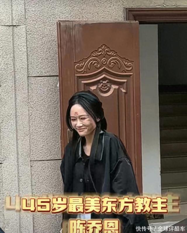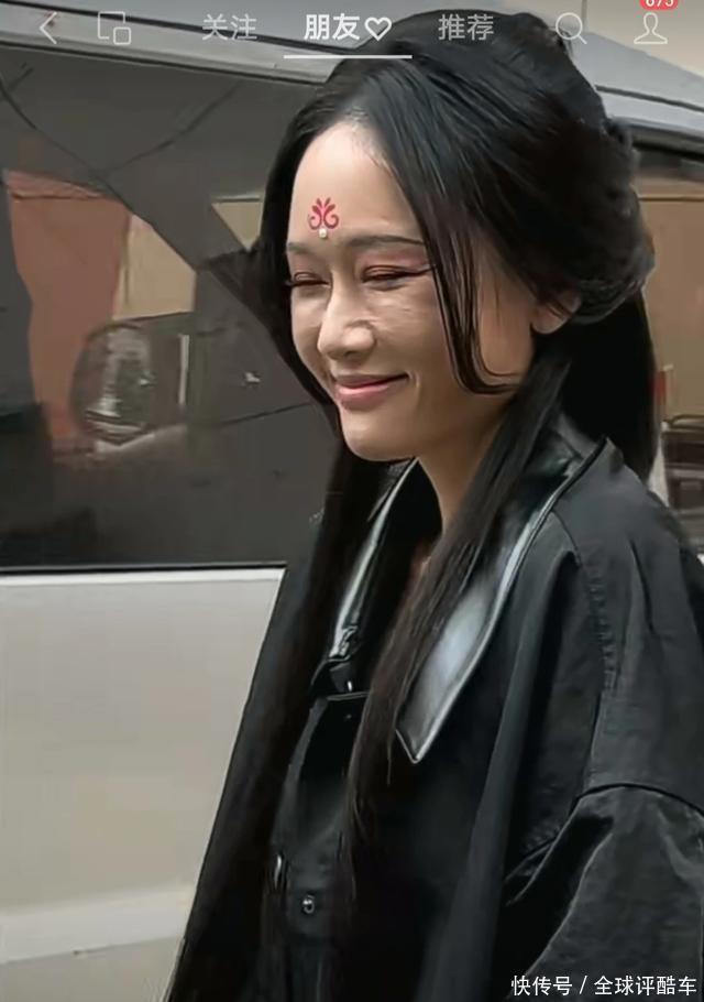 ?????? 镜头中的陈乔恩看起来像是刚刚忙完工作,她的头饰还没有摘,头上还带着假发的装饰,她脸上眉心处做了一个标志,看起来很像她扮演的经典角色东方不败。