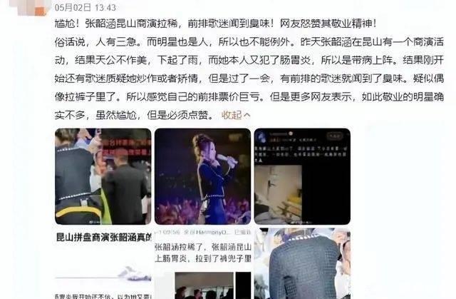 而这时候网上不知是哪位人才,传出在前台能够闻到臭味,并且还传出一张什么都看不清楚得照片,吐槽张韶涵在演唱会期间拉稀了,
