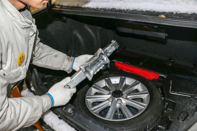 将车辆靠边停在不妨碍交通正常通行的位置(高速公路应急车道),拉好手刹并打开双闪。将三角警示牌摆放在车辆后方,按照交通法规定:日常道路摆放距离为50-100米,高速路段需扩大到150米以上。工具通常都在后备厢暗格中,备胎一般放置在后尾箱垫子下面。先拿出换胎工具,包括千斤顶、套筒扳手等,再拿出备胎。