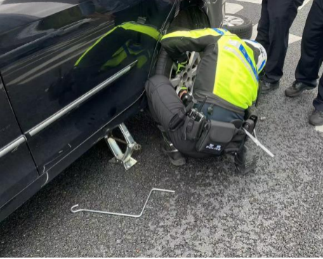 了解情况后,民警立即让驾驶员打开双闪,在车辆后方设置好安全警示防护,然后帮忙换胎。一边更换一边进行讲解,并提醒驾驶员在车辆发生故障时一定要打开双闪做好安全防护措施,避免二次事故的发生,如遇紧急情况应该报警求助,而不是坐在车里等待,特别是在高速公路上,谨记“车靠边 人撤离 即报警”九字警句。不一会儿,轮胎换好了,车内人员对民警的热心帮助表示感谢。