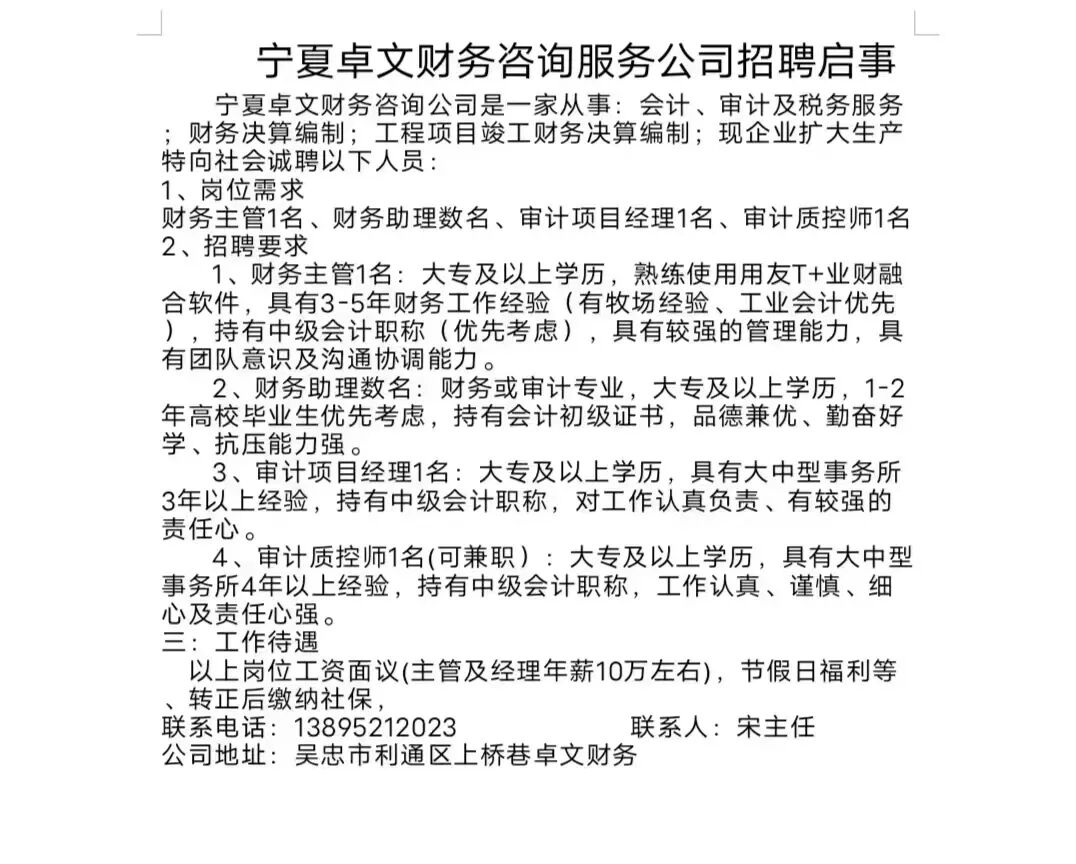 以上岗位缴纳五险,享受节日福利,家在金积附近的优先考虑。