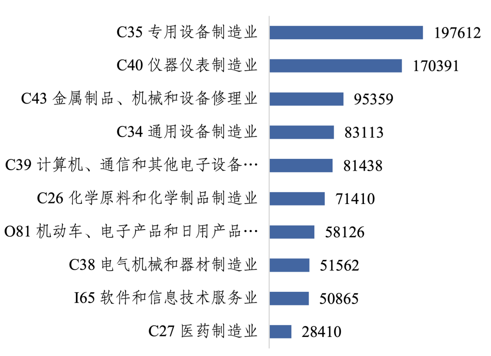 在专利申请方面,近三年,全国高校专利总量超过167万件,其中高校50强专利总量超过65万件,占比约39%。在高校50强中,72%的高校近三年申请专利数量超过5000件,34%的高校专利申请量高于8000件,10%的高校专利申请量和授权量分别超过10000件和7000件。就行业分布而言,针对专用设备制造业领域的专利数量最多,其次是仪器仪表制造业,金属制品、机械和设备修理业以及通用设备制造业。