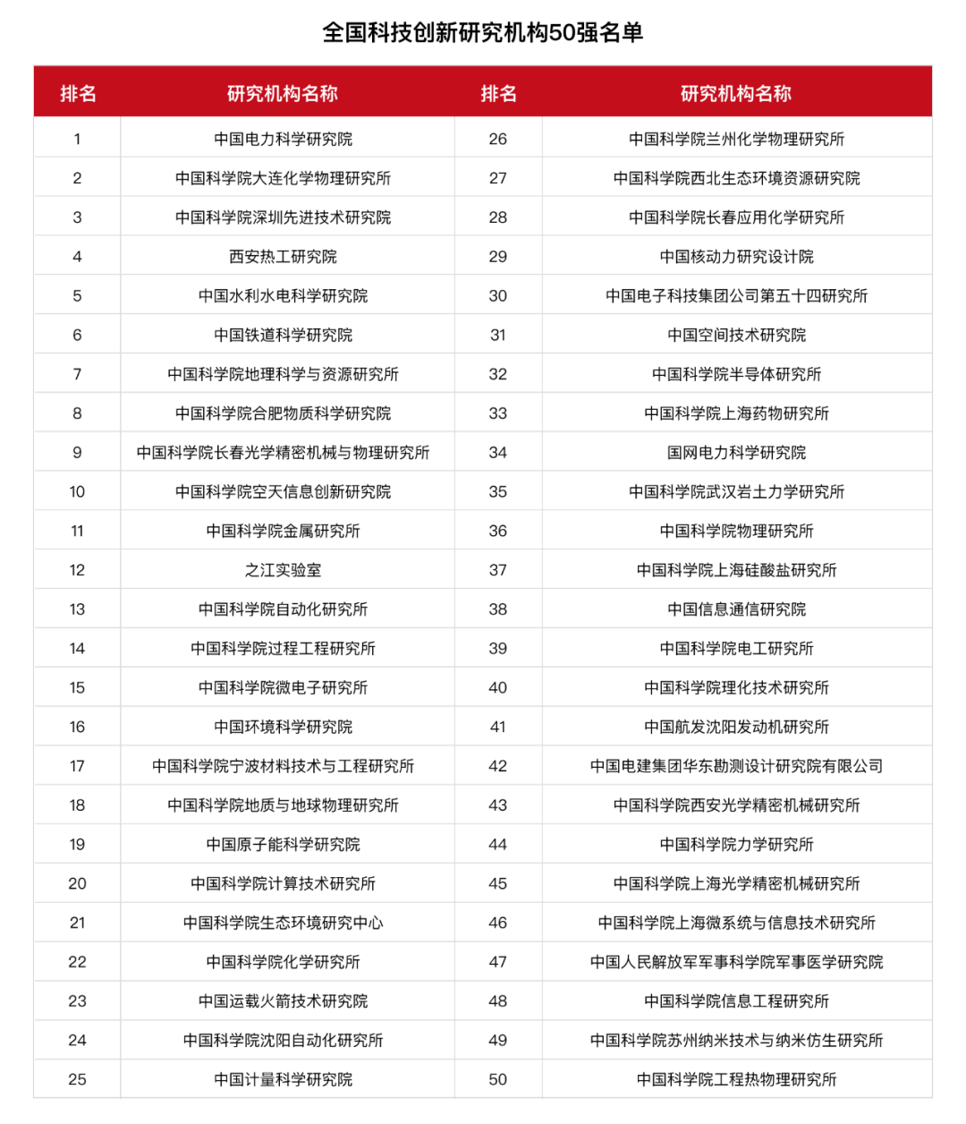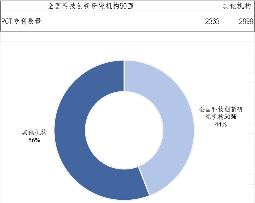 研究机构作为科技创新与成果转化的中枢节点,在创新方面与高校有诸多相似之处。例如,在“全国科技创新研究机构50强”中,东部地区数量依然最多,近三年,PCT国际专利申请聚集度仍相对较高,且针对制造业领域的技术创新占比较大。不同点在于,近三年,研究机构的专利数量并不多,在研究机构50强中,只有8%的专利申请量超过3000件。