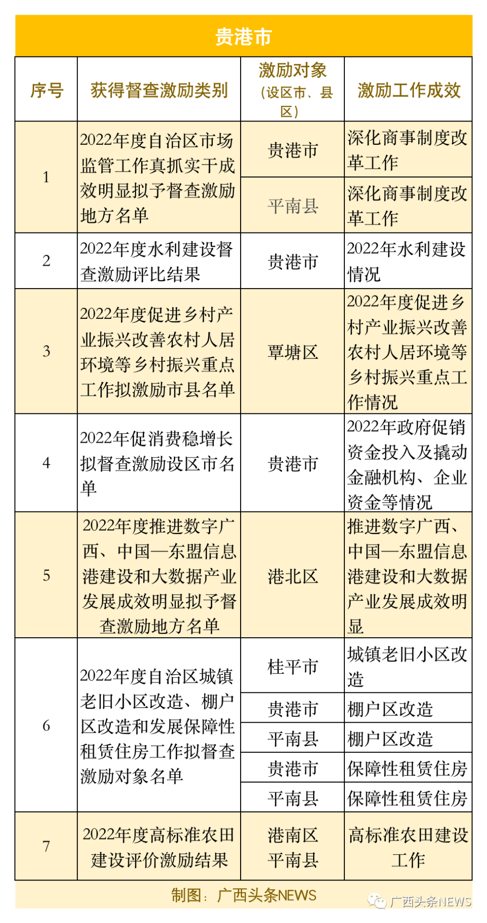 近期,广西多个部门公示一批督查激励名单,对2022年落实有关重大政策措施真抓实干、取得明显成效的市(县、区)进行激励,广西头条NEWS梳理了近期的公示名单,看看哪个市是最大赢家?你的家乡入选了吗?
