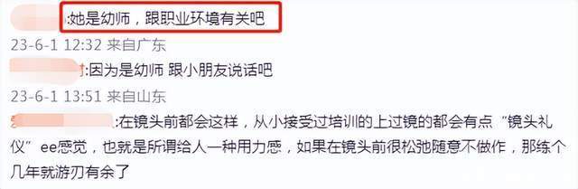 不过也有网友讲这样说话跟幼师身份有关,面对的受众是小朋友,还没有改正过来。还有就是面对镜头不够成熟,可能跟以前接受过“镜头礼仪”培训有关,会有一种用力感。