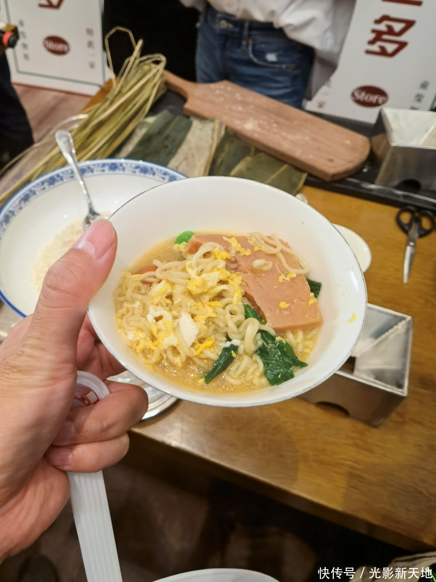 第三个暖心细节,是发嫂真的太贴心了。发哥煮好车仔面,问有谁想吃,我第一个举手,发嫂看到后就一直在提醒发哥将盛好的面交给我。这碗面里加了火腿、香肠和青菜,味道非常不错,很快一扫而光。吃完后发嫂隔着桌子和我聊了好一会儿天。