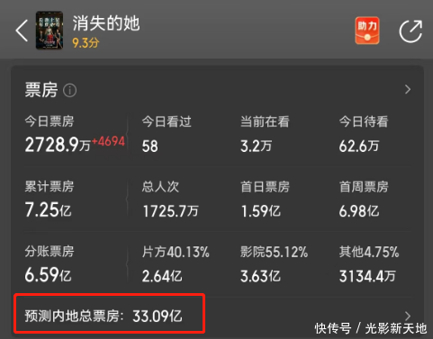 6月22日上映首日票房超过1.5亿,端午节三天假期票房占比持续走高,6月25日是工作日,但依然用39.3%的排片占比拿下整个市场77.5%的票房,由于上涨太快,专业票务平台预测的最终票房,已经从最初不到10亿,涨至目前超过33亿。