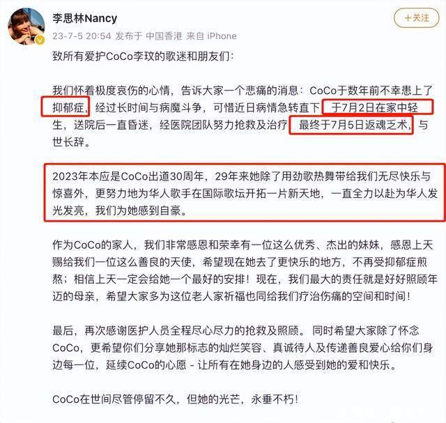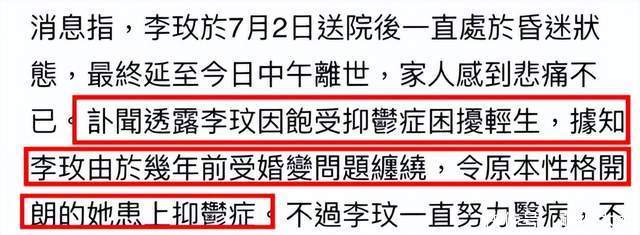 据李玟姐姐透露,她于数年前患上了抑郁症,经历长时间与病魔斗争后情况急转直下,于7月2日在家中轻生,送院后一直昏迷,最终于7月5日去世,年仅48岁。