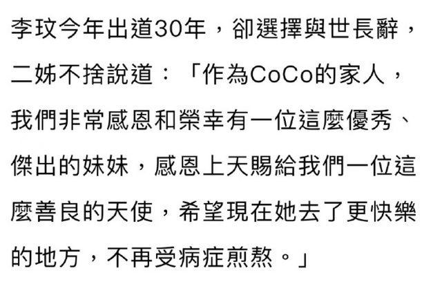 姐姐还称2023年是李玟出道30周年,在过去的29年里她用热歌劲舞带给大家很多快乐与惊喜,并努力为华人歌手开拓了天地。家人也很荣幸有这么优秀的妹妹,希望她去更快乐的地方,不受抑郁症困扰,同时也感谢医护人员尽心地抢救和照顾。