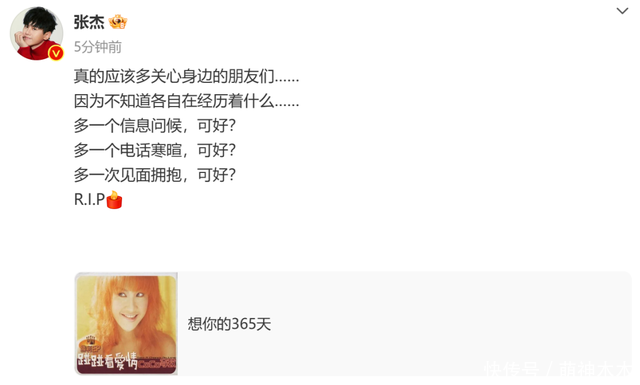 张杰更是以此为戒,呼吁大家多关心身边的朋友们,因为不知道会在经历什么,给彼此多一个问候、寒暄、拥抱。