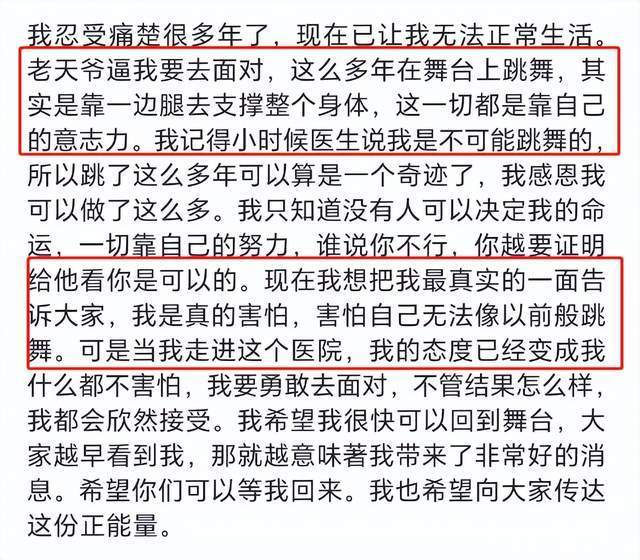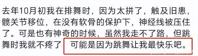 也有网友觉得腿伤是压垮她的最后一根稻草。在2月的时候,她提到自己的腿伤情况,并透露了自己天生左腿有缺陷,这么多年能够站在舞台上跳舞全靠意志力支撑,讲了小时候的恐惧以及跳舞带来的快乐。知情人也透露歌迷两周前去看望她,她因为复健的缘故当场落泪,能感受到她的辛苦。