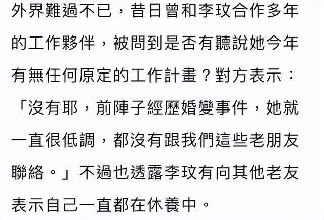 昔日合作伙伴提到李玟称她没有原定的工作计划,表示自从经历婚变事件,李玟就很低调,没有跟老朋友联络,但有向其他老友透露在休养。