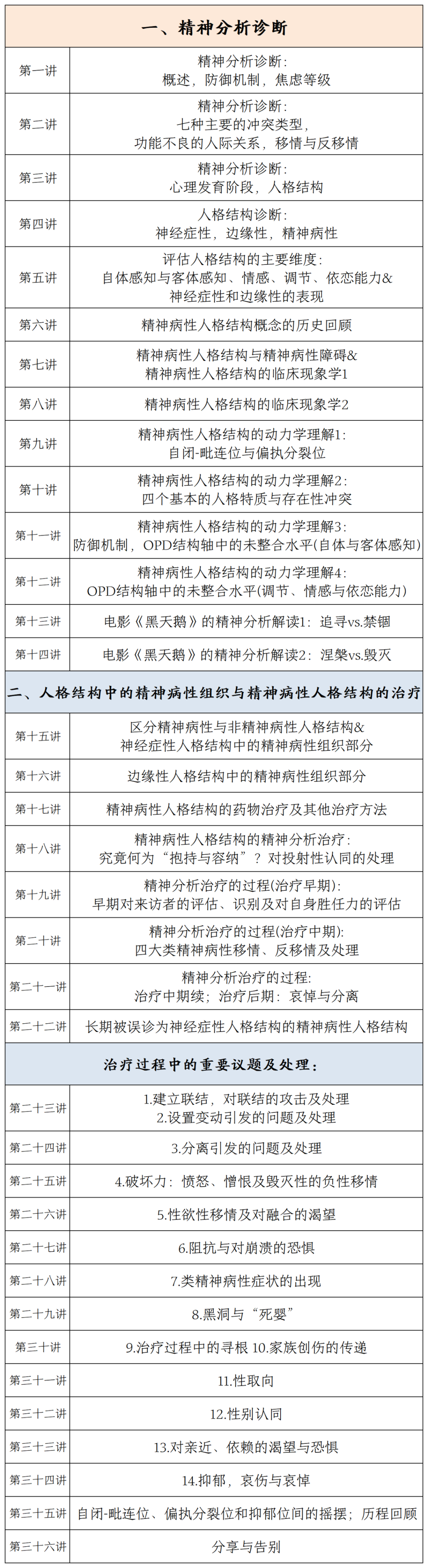 课程的第一部分即是吃透上图中的各个维度并理解各维度之间的关系,之后你将不会再被来访者提供的材料所淹没,而是可以使用这张诊断图来整理、组织、理解来访者的材料,这也是写作案例报告的动力学理解部分的逻辑框架。课程的第二部分,吴艳茹博士将带我们学习如何识别与治疗精神病性人格组织,那么,