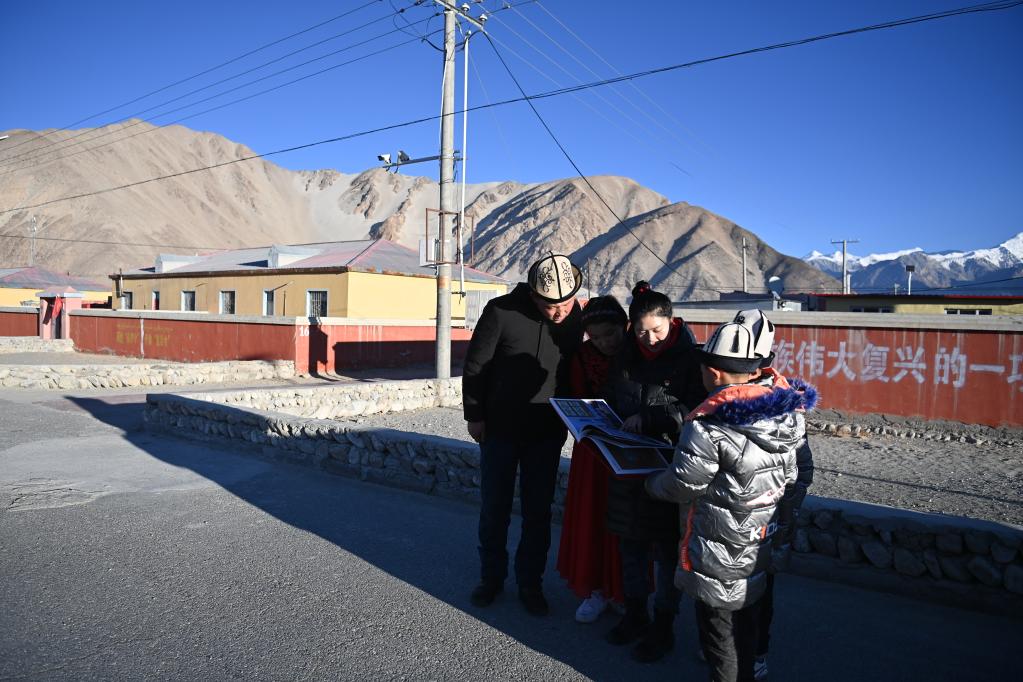 12月17日,新疆克孜勒苏柯尔克孜自治州阿克陶县布伦口乡布伦口村,李文娟(中)在向当地村民宣讲党的二十大精神。新华社记者李响摄