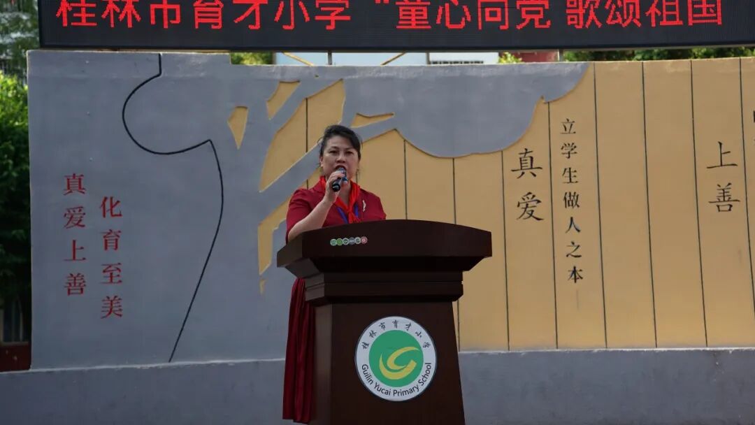 活动伊始,桂林市育才小学李真校长、书记为本次爱国主义教育活动激情致辞。李真校长表示,育才小学始终坚持以习近平新时代中国特色社会主义思想为指导,认真贯彻落实党的“二十大”精神,坚定铸魂育人的工作目标贯彻党的教育方针,贯彻习近平关于教育的重要论述,构建育才新发展格局,创新育才高质量发展体系,推动立德树人根本任务为重要进展。李校长在大会上真切地希望同学们向上而生,向美而长;希望同学们坚定地努力扣好人生每一粒扣子,坚定理想信念、志存高远、全面发展,每天都与最美的自己相遇,满怀信心奔向未来,奔向幸福;希望同学们努力做具有中国灵魂的清新、乐学、至美成长的育才人,做有理想信念、有家国情怀的时代新人,做中华民族伟大复兴的社会主义建设者和接班人。