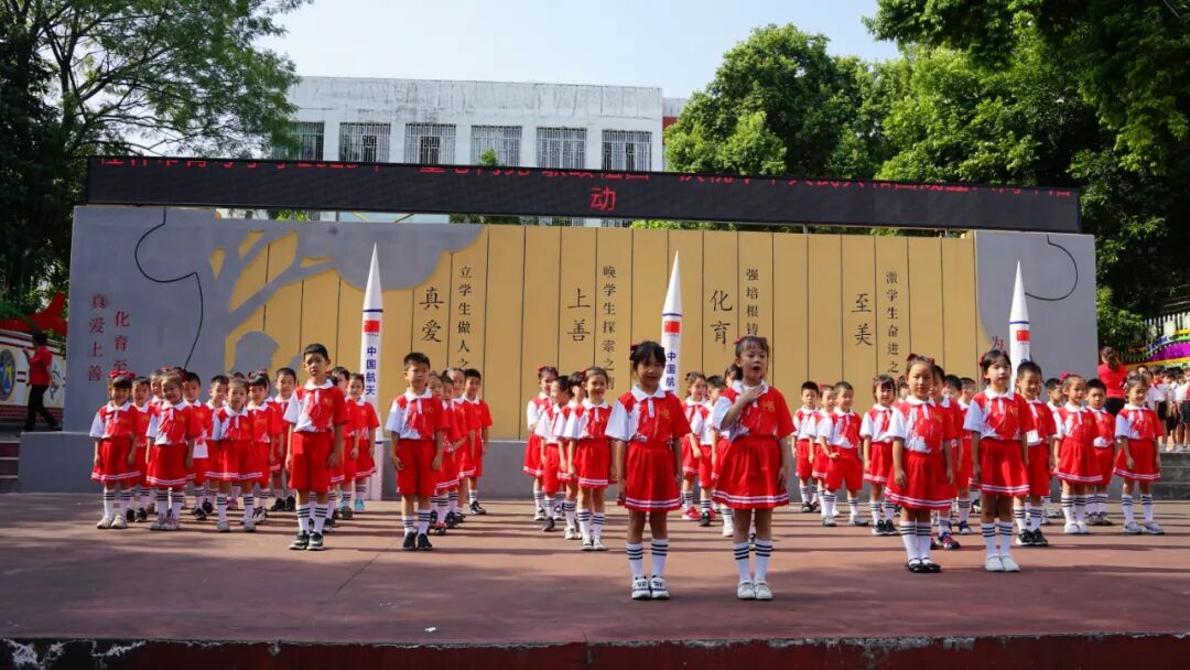 接下来进行的是庆祝祖国、歌颂祖国文艺展演。各班师生用一个个精彩的节目表达对祖国的祝福,用自己铿锵有力的朗诵、婉转动听的歌声、优美的舞姿等来迎接祖国母亲的生日。在五年级3班表演的情景剧《我的梦 航天梦》中,嘉宾蒋作宏和王德祥分别给学生们介绍了我国航天事业的发展进步,激励孩子们勇于探索、敢于创新,将来为祖国的航天事业做出更大贡献。动听地歌声、整齐地掌声、欢快地欢笑声充满整个校园,全体师生热情地携起手,激昂地抬起头,歌颂我们祖国创造的辉煌,感恩我们幸福的生活,共同祝福亲爱的祖国繁荣富强。