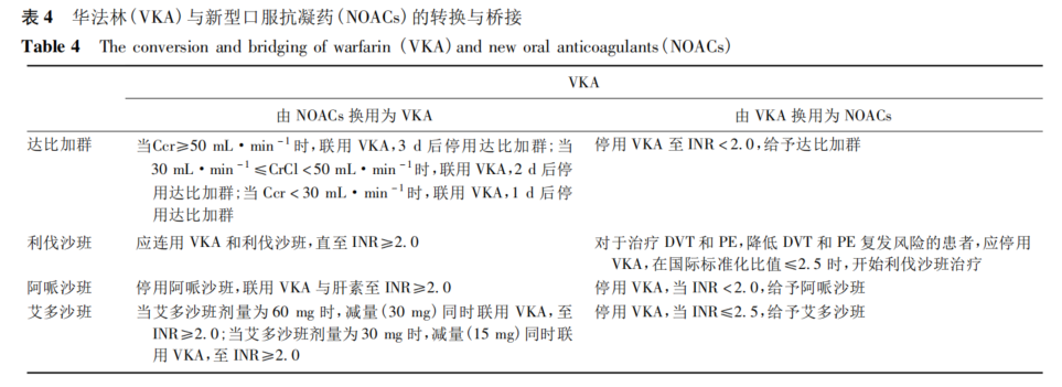 华法林与NOACs之间的转换与桥接方案主要来自药品说明书,见表4。