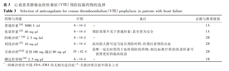 对于住院3d以上的Ⅲ~Ⅳ级心衰患者、或心衰伴制动3d以上、或心衰伴有严重感染、抑或是VTE评分高危/极高危的患者无抗凝禁忌时,应预防性抗凝,预防使用抗凝药物方案,见表3。