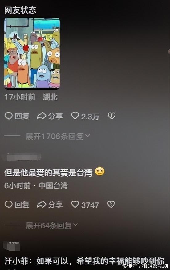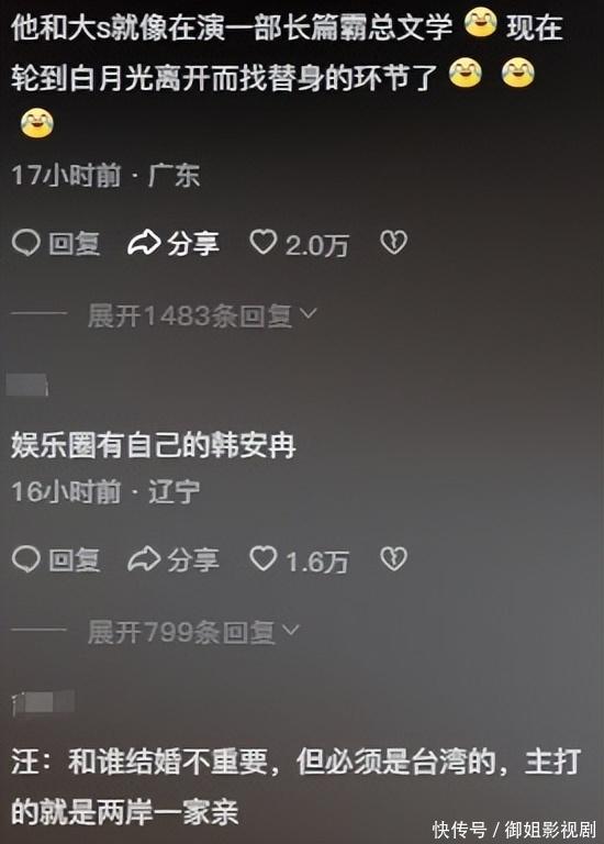 “汪小菲,原来你心系同胞,甘愿献出真身,格局真的很大”。“你快别叫汪小菲了,汪安冉这个名字更适合你,再参加个《台北婚姻变形计》,齐活儿”。