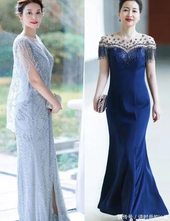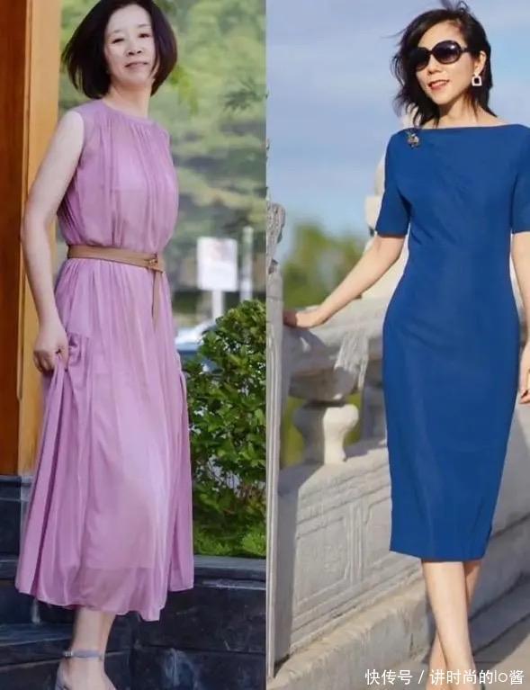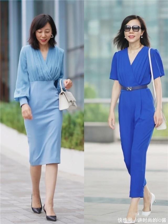 在众多的冷色调当中,蓝色是最值得中年女人去尝试的,无论是天蓝色、宝石蓝还是藏蓝色,都可以大面积的覆盖在连衣裙上。特别是修身款式的连衣裙,用冷色调不显更显瘦,还能提升贵气范儿。