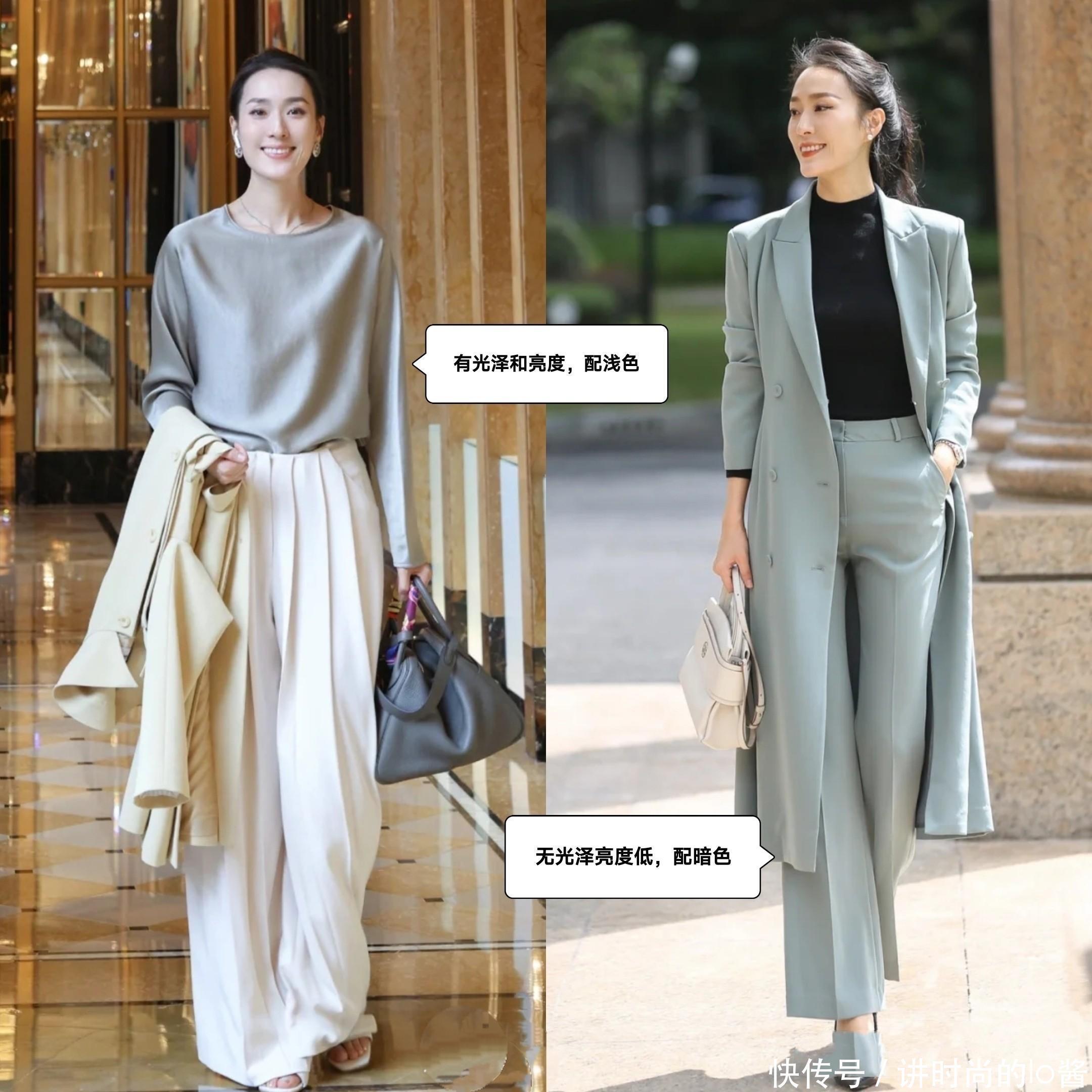 色彩和服装面料之间,拥有着相辅相成的效果,具备一定光泽感的丝绸材质,更适合跟浅色系进行组合,能够轻松穿出高贵气质。无光泽感的哑光感面料,则很适合跟暗色搭配,低调又不失高级感。