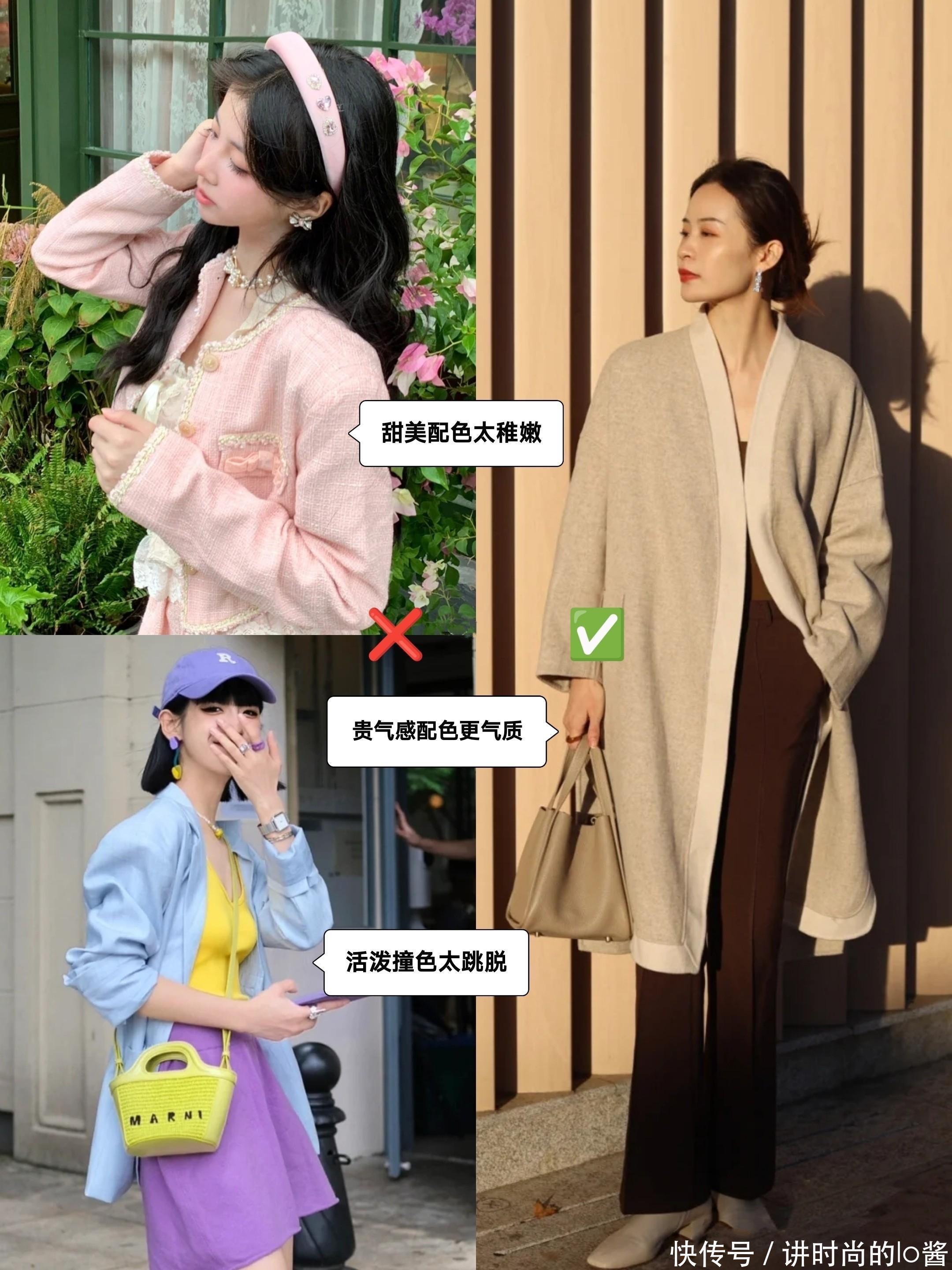 踏入中年阶段,最应该强调的是高级的气质,如果你选择的衣服配色太甜美,就会显得很稚嫩不成熟;撞色太活泼的话,又会给人一种跳脱违和的感觉,所以“贵妇色”才是最好的选项。