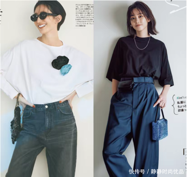 就像这种黑白色T恤搭配高腰裤,简单清爽又利落,纯色的服装搭配也比较整洁,不会有繁琐感。