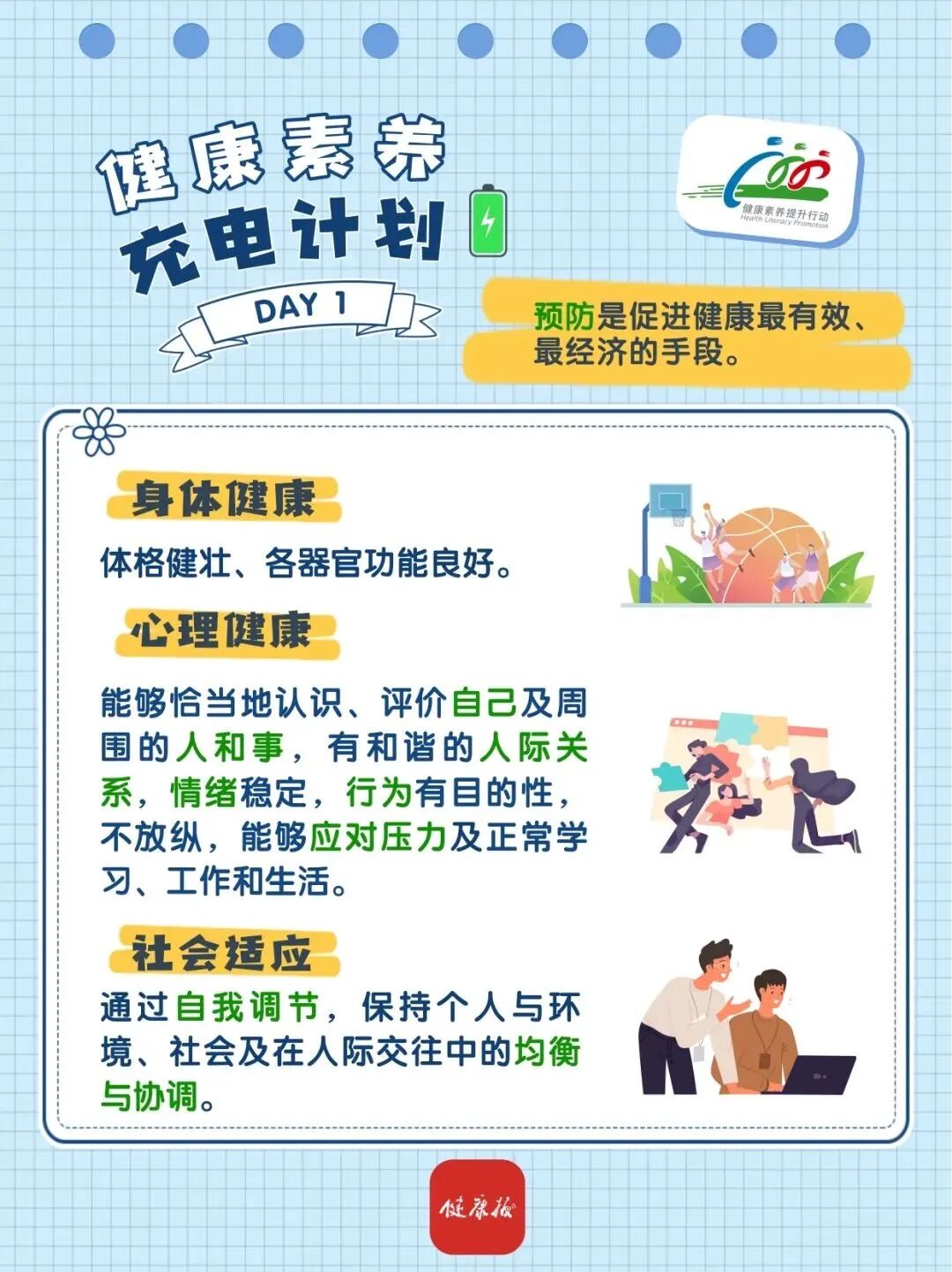 健康不仅仅是没有疾病或虚弱,而是身体、心理和社会适应的良好状态。预防是促进健康最有效、最经济的手段。