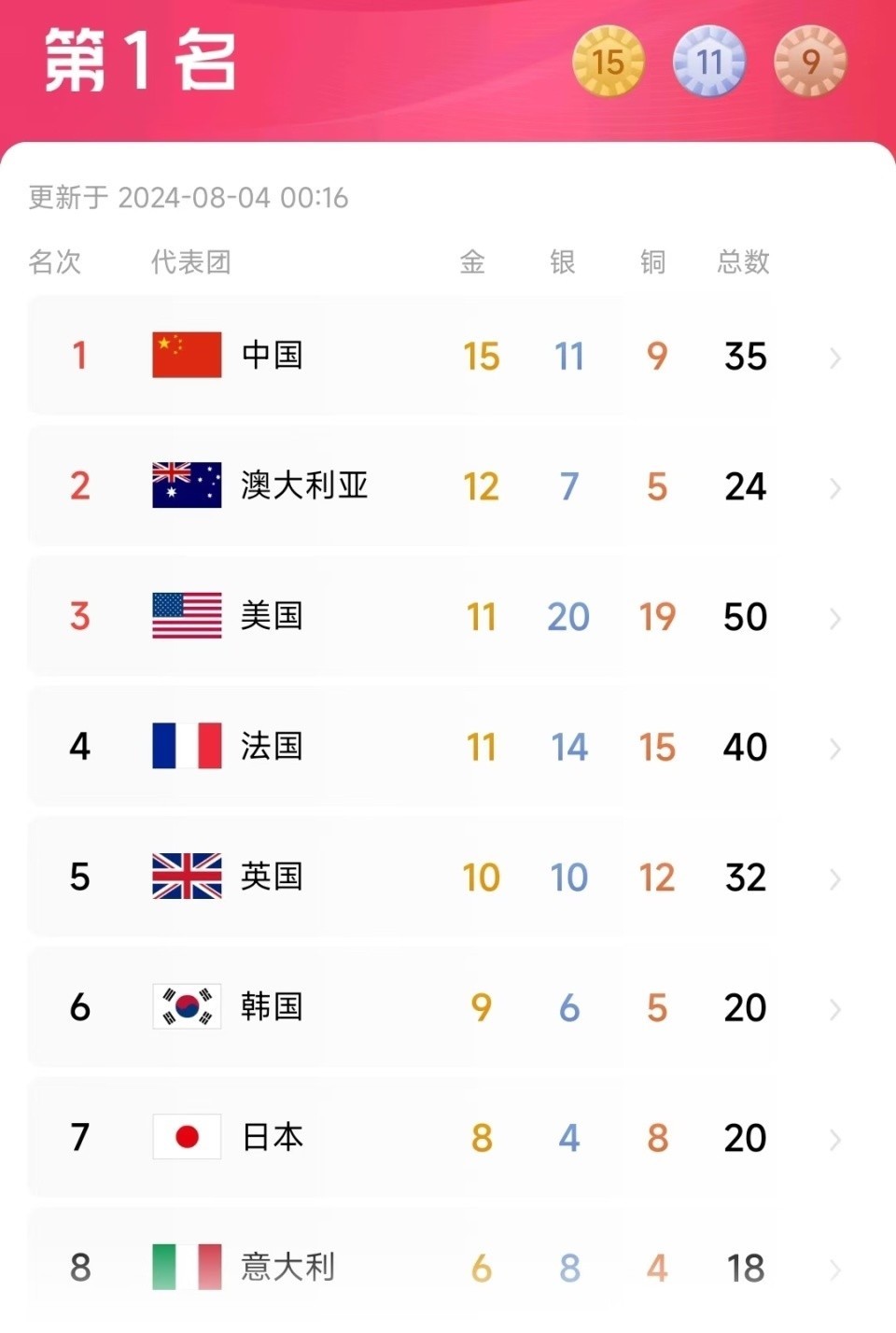 北京时间8月4日消息,2024年巴黎奥运会继续进行。随着卫冕冠军陈梦以4-2完胜世界第一孙颖莎夺得乒乓球女子单打金牌,陈清晨/贾一凡以2-0战胜队友刘圣书/谭宁夺得羽毛球女子双打金牌,中国奥运代表团金牌总数达到15枚,领先第二名澳大利亚3金。