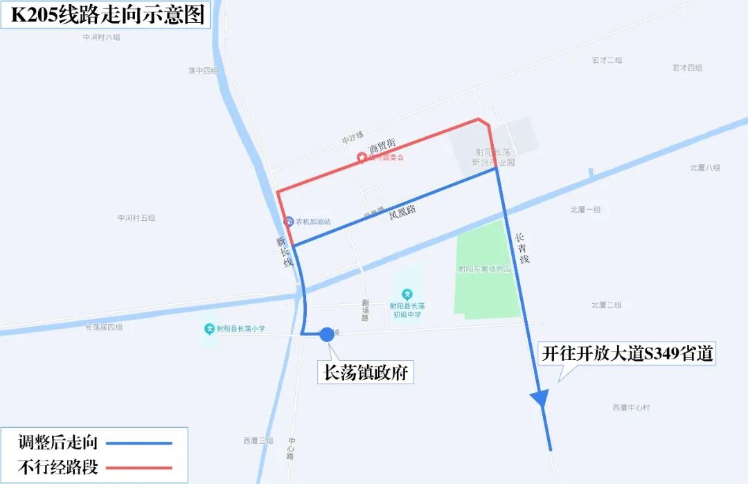因射阳县境内宏才村内部道路施工,8月21日起,公交K205线实行临时改道行驶,具体如下: