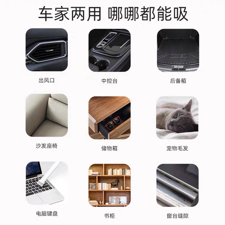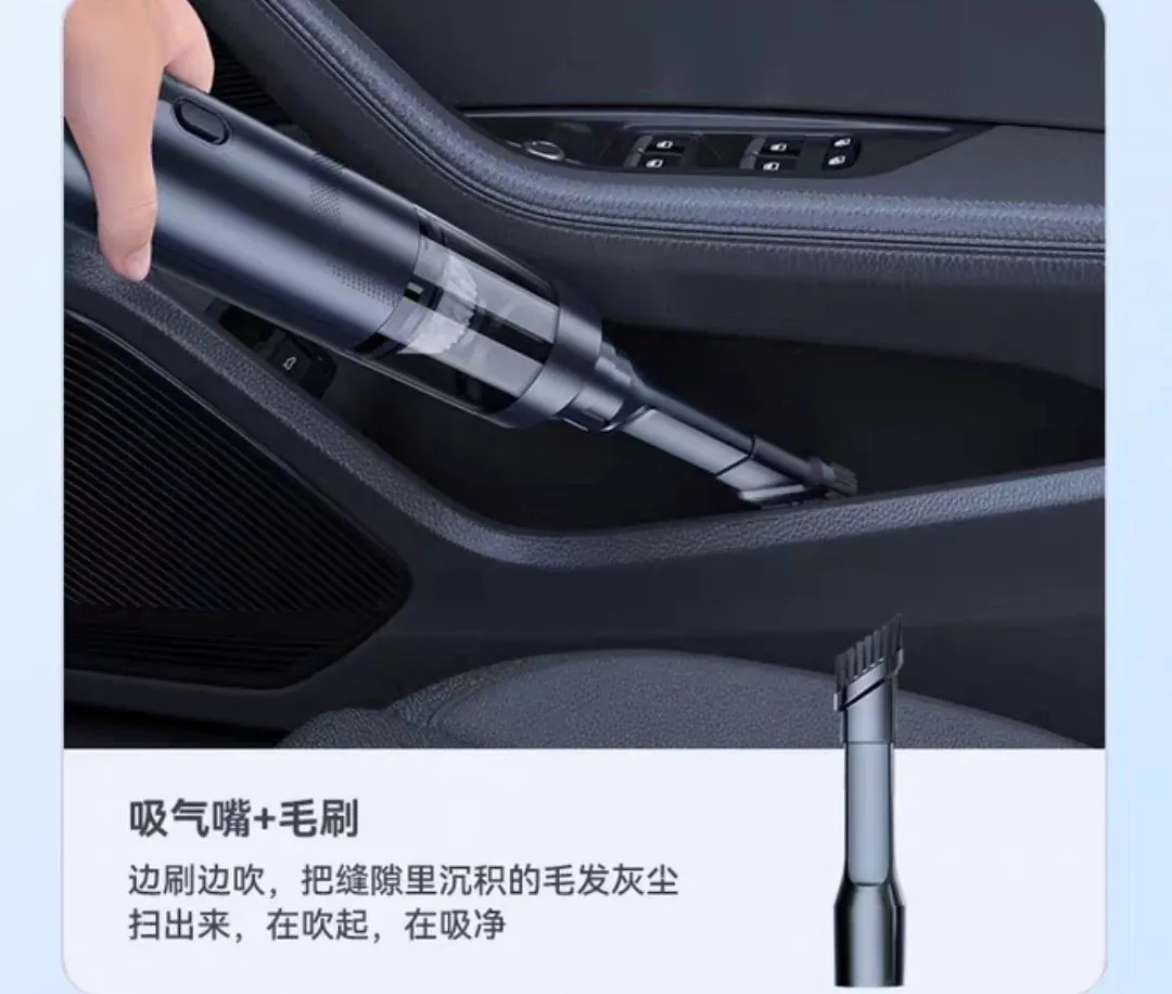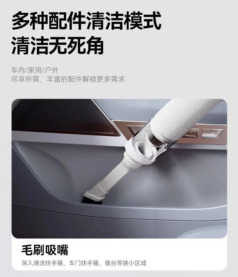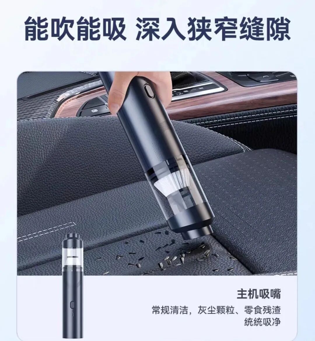 尤其是那些犄角旮旯里,总是布满了各种灰尘、沙砾……怎么搞也清理不干净。不仅车上脏,家里的沙发、床头缝隙、家具摆件死角灰尘....都是又脏又难清理的重灾区。而家里有毛孩子就更惨了,不管在哪各种食物残渣、零食碎屑,总会掉得到处都是,坐椅、沙发的缝细里更是不忍直视。每次都想好好清洁一番,但面对这种细微的碎屑和灰尘,徒手清理真的很难,越清理屑越碎。而定期去洗车店清洁,不仅费时费力,最重要的钱包遭不住哇!直到最近在4S店上班的朋友给我推荐了这款——【吹吸两用车载吸尘器】,才拯救了车内的清洁问题!这是一款集功能性、实用性、工艺感于一体的车载家用吸尘器,精致小巧,随拿随用,体验后仿佛打开了新世纪的大门般~不管是毛发、沙子、零食碎屑、还是各种食物残渣,它统统都能帮你搞定!!刚拿到它时,看到矿泉水瓶大小的机身,真的完全不会想到这是一款吸尘器!