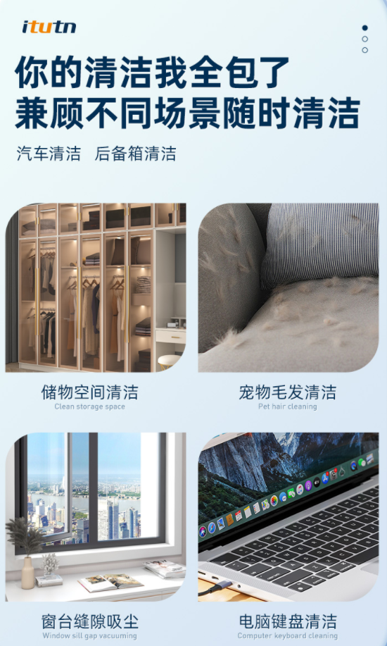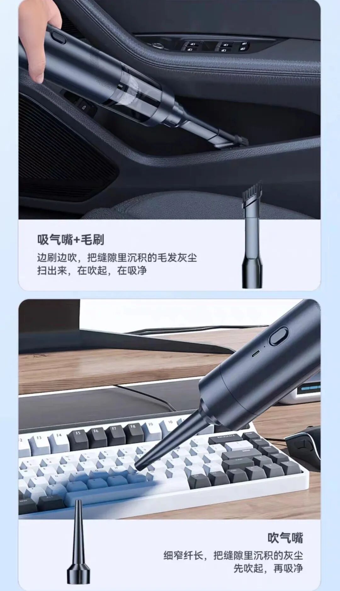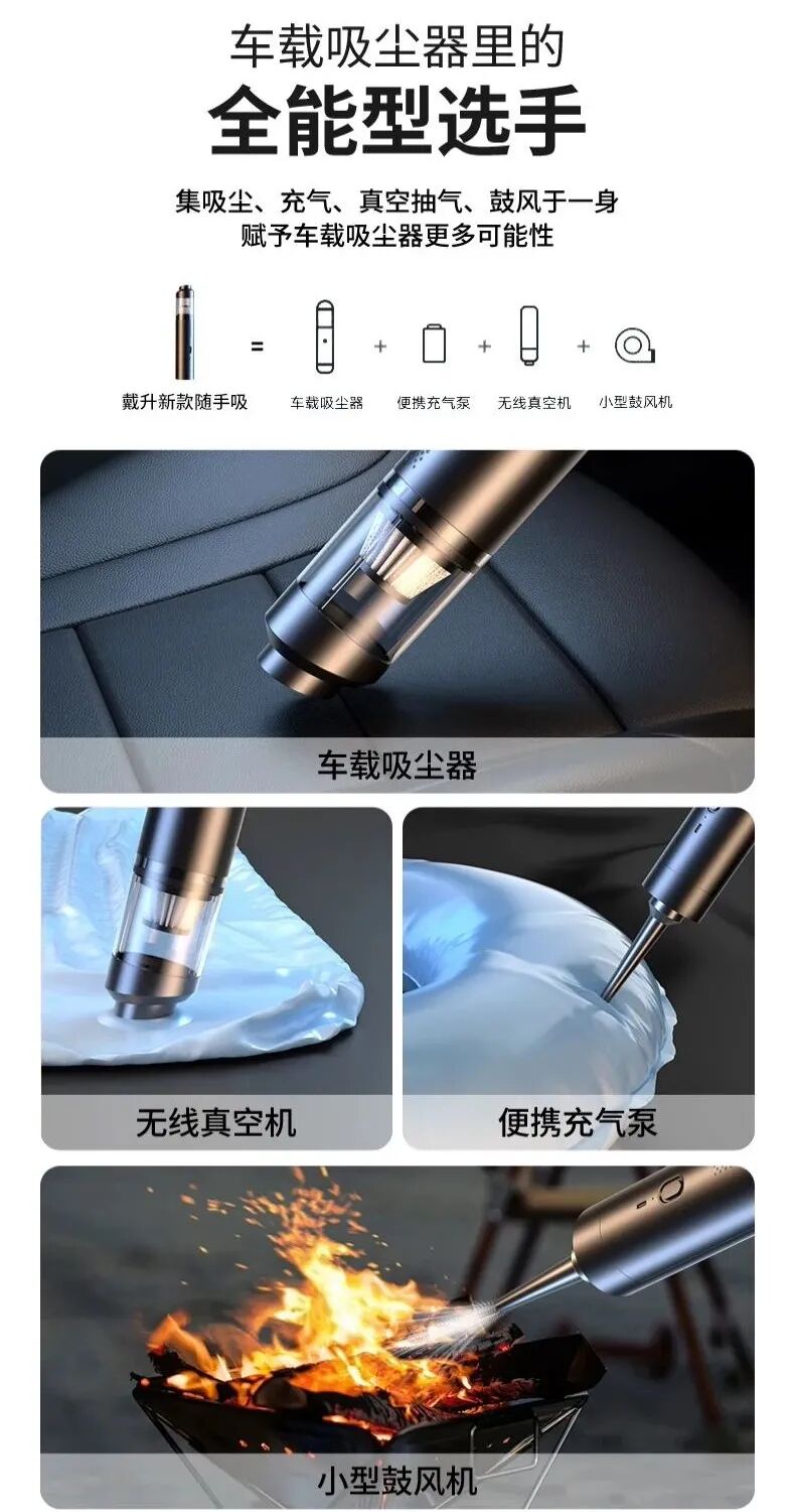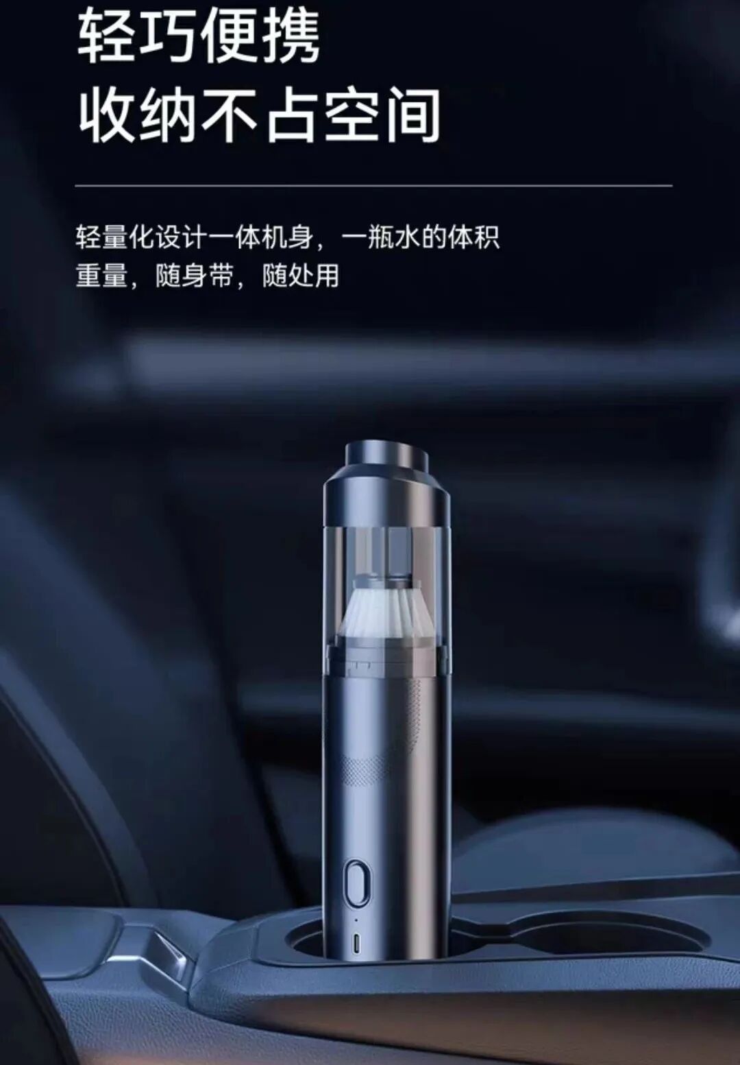 尤其是那些犄角旮旯里,总是布满了各种灰尘、沙砾……怎么搞也清理不干净。不仅车上脏,家里的沙发、床头缝隙、家具摆件死角灰尘....都是又脏又难清理的重灾区。而家里有毛孩子就更惨了,不管在哪各种食物残渣、零食碎屑,总会掉得到处都是,坐椅、沙发的缝细里更是不忍直视。每次都想好好清洁一番,但面对这种细微的碎屑和灰尘,徒手清理真的很难,越清理屑越碎。而定期去洗车店清洁,不仅费时费力,最重要的钱包遭不住哇!直到最近在4S店上班的朋友给我推荐了这款——【吹吸两用车载吸尘器】,才拯救了车内的清洁问题!这是一款集功能性、实用性、工艺感于一体的车载家用吸尘器,精致小巧,随拿随用,体验后仿佛打开了新世纪的大门般~不管是毛发、沙子、零食碎屑、还是各种食物残渣,它统统都能帮你搞定!!刚拿到它时,看到矿泉水瓶大小的机身,真的完全不会想到这是一款吸尘器!