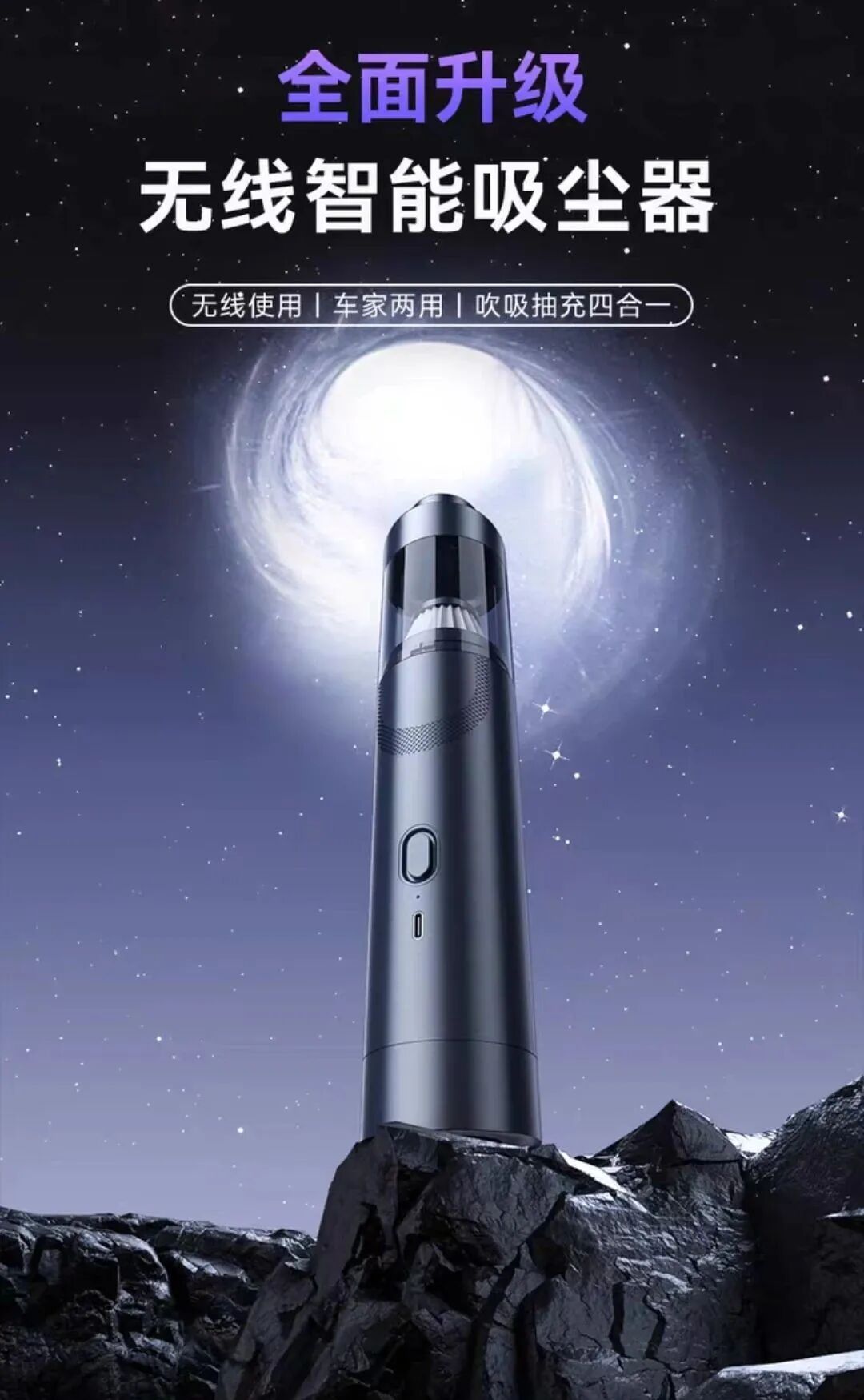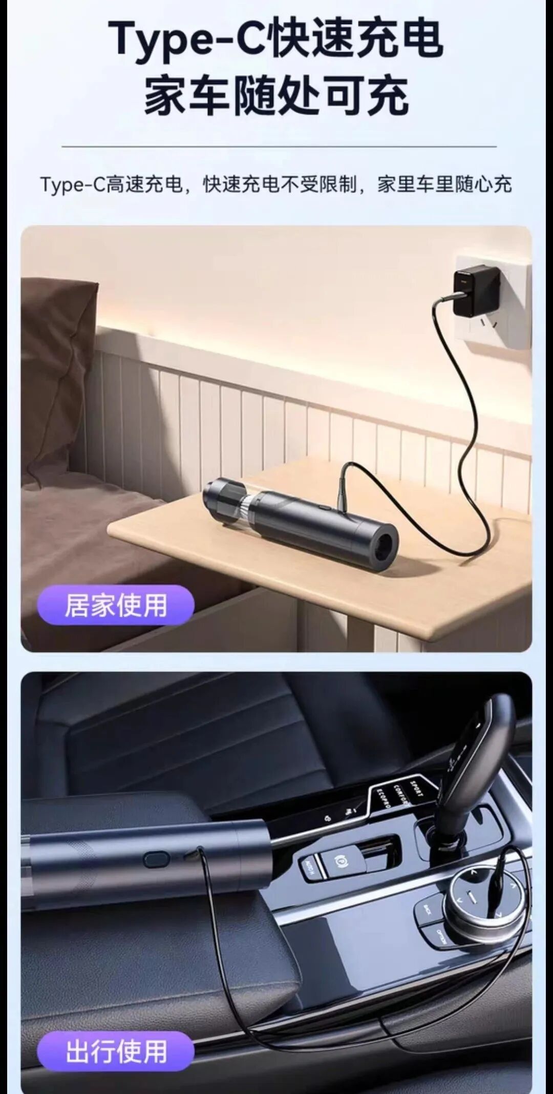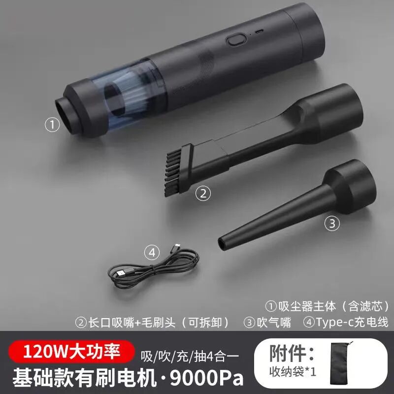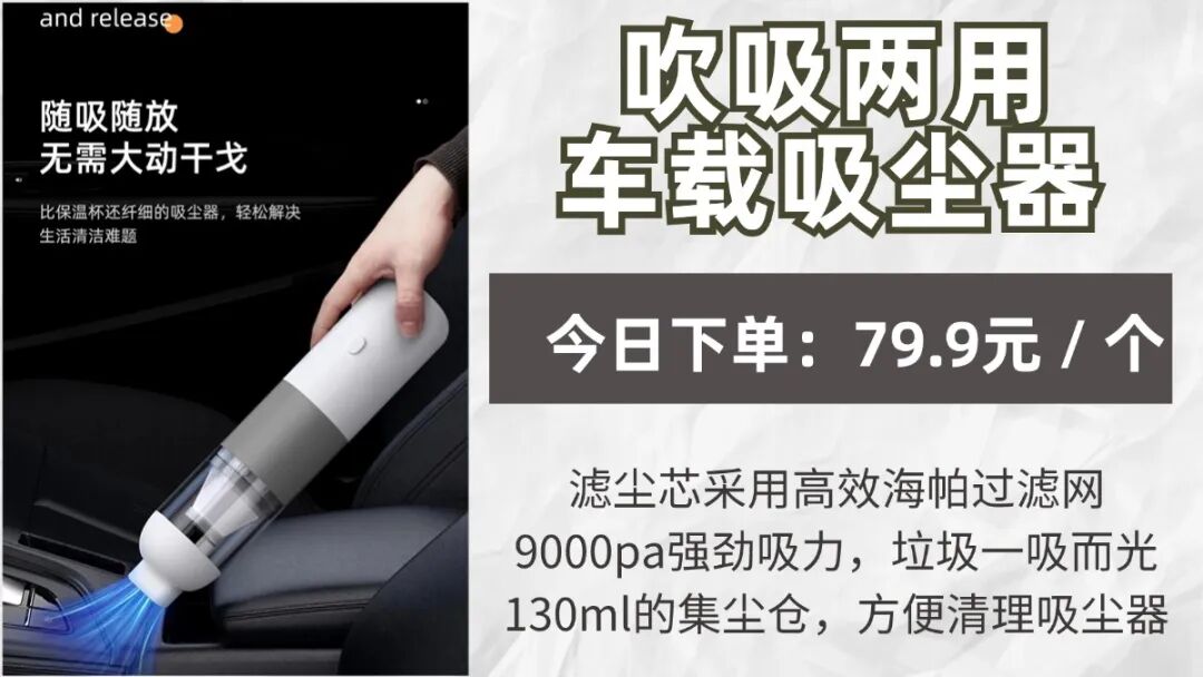 不仅如此,只要将吸尘器反过来用,立马就能变成一个吹风筒!整台吸尘器就有一个按钮,在吸尘器有电的情况下,按下电源键,开始工作,再次按下就是停止工作。对于垃圾来说,它就是“黑洞”,一旦被它盯上都将无处可逃。大的小的、颗粒的絮状的垃圾,一扫一吸,全部「连根拔起」!买一台就相当于拥有了=1台吸尘器+1台吹风机+1个吹气筒+1个真空机,简直划算到爆!!这么方便又实用的无线车载家用小型手持吸尘器,真的每台爱车,每个家庭都应该备上一台,除此之外,吸尘器的无线的设计真的深得我心,想用的时候,随手拿起来就可以开始打扫了,非常方便,随时可以拿到车内使用。每一台吸尘器都会搭配一条Type C充电线,吸尘器没电了,随时都能冲!!并且机子的集尘仓透明可视,随时观察灰层有没有装满,轻松一拧就能打开,非常方便清理吸尘器!而且滤尘芯采用的是高效海帕过滤网,微尘颗粒也能吸入,而且还能用水洗,可以重复利用,既环保又能保持吸尘器的洁净!这么方便又实用的单品,真的每个家庭都值得入手1台!这款车载吸尘器有黑色,白色和蓝灰色这三个颜色,大家可以选择喜欢的颜色下单!有了它不管是汽车坐椅、脚垫上的沙砾、灰尘,还是沙发上,地毯上的毛发、零食碎屑都能轻松清理~甚至就连窗户边角,键盘机箱这些缝隙里的灰尘脏污,它统统都能轻松帮你搞定,简直不要太方便。趁着这高性价活动入手巨划算,不过,数量有限,售完即止,抢到就是真的赚到啦!!
