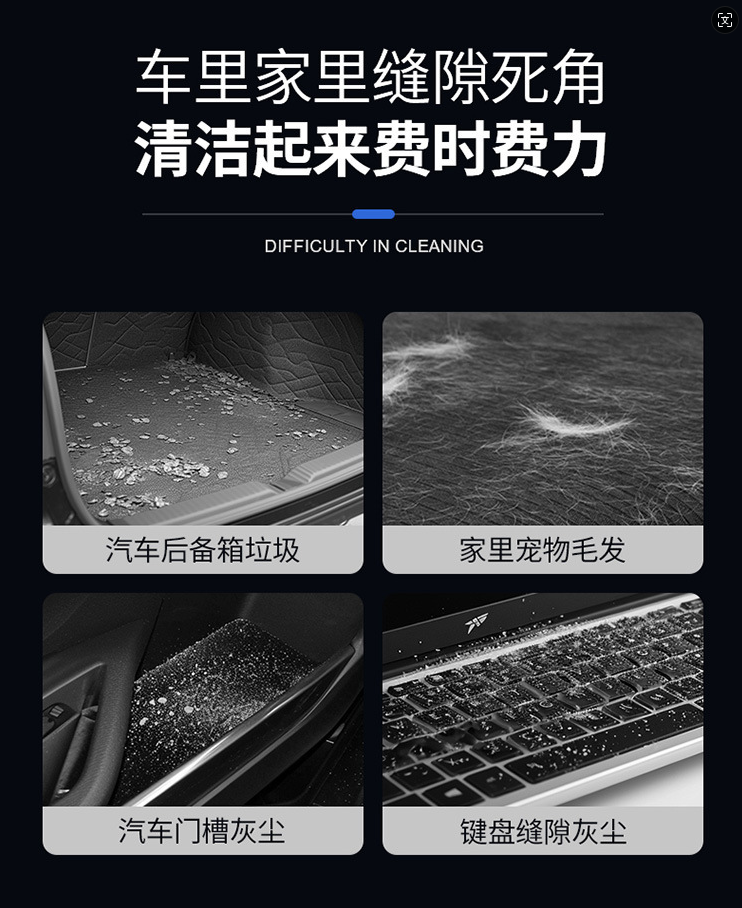 比如键盘缝隙里的灰尘,车内的中控台,空调出风口处的灰,清洁后好像新的一样!!