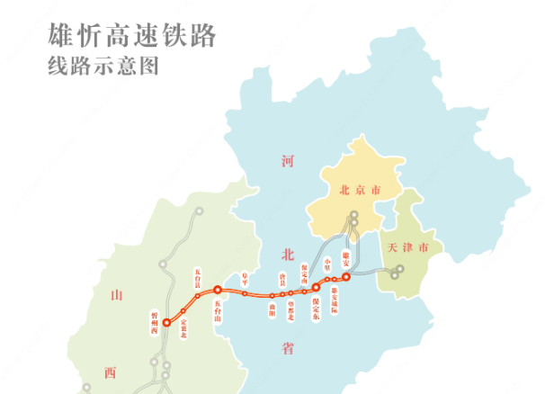 雄忻高铁是我国“八纵八横”高速铁路网京昆通道的重要组成部分,全线设13座车站,线路东起京雄城际铁路雄安站,西至大西高铁忻州西站,正线全长342公里,设计时速350公里。